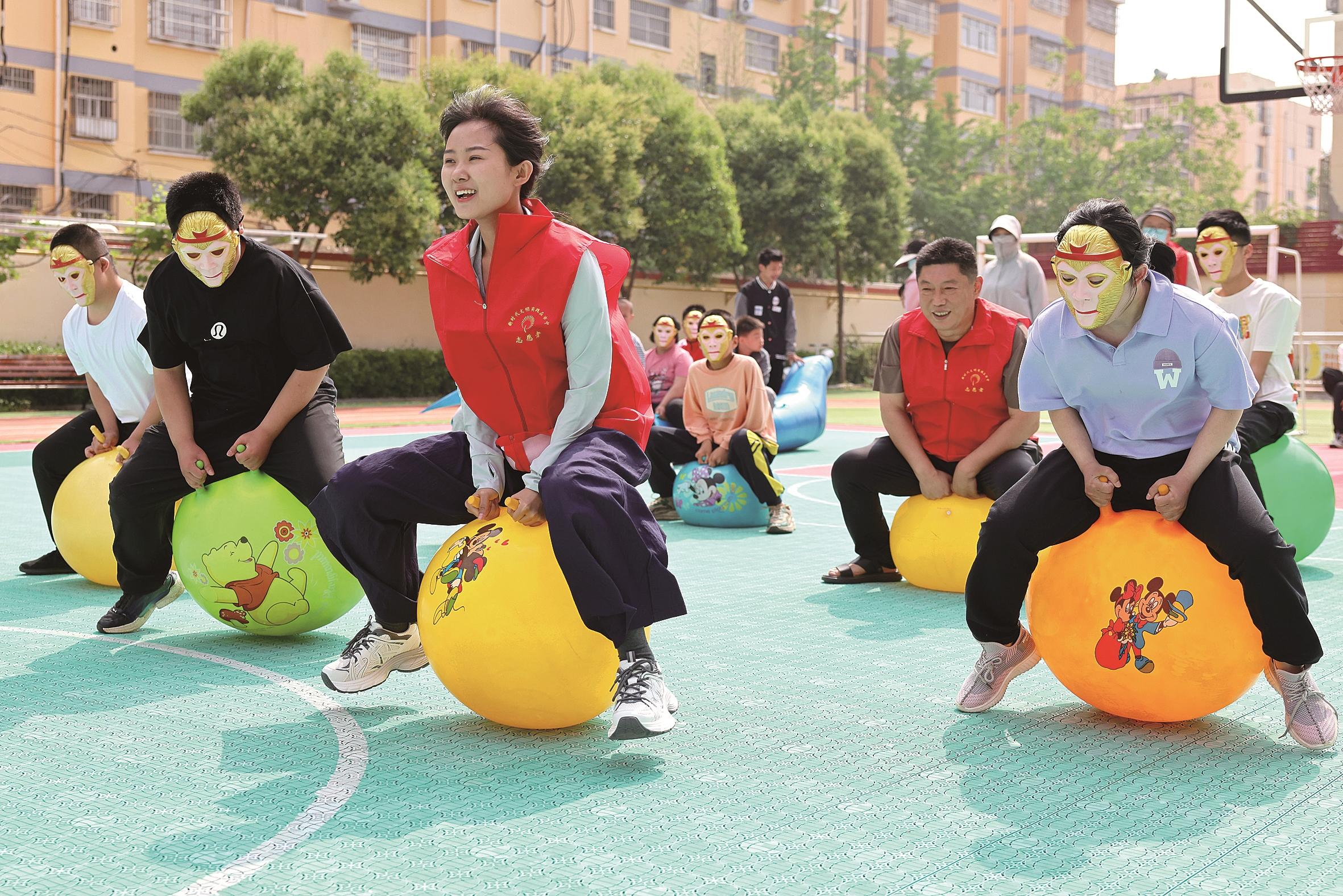 5月16日,在山东省枣庄市市中区特殊教育中心,青年志愿者与智力障碍学生一起做趣味游戏。新华社发(孙中喆 摄)