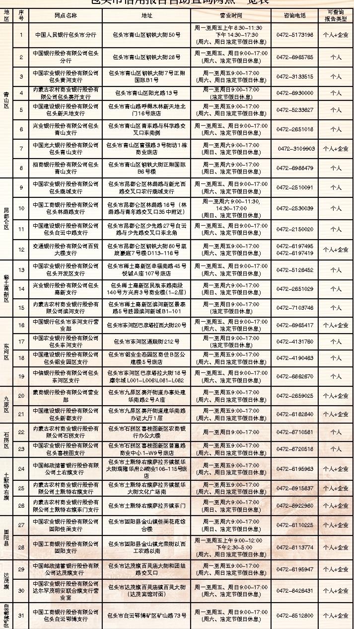 包头市信用报告自助查询网点一览表