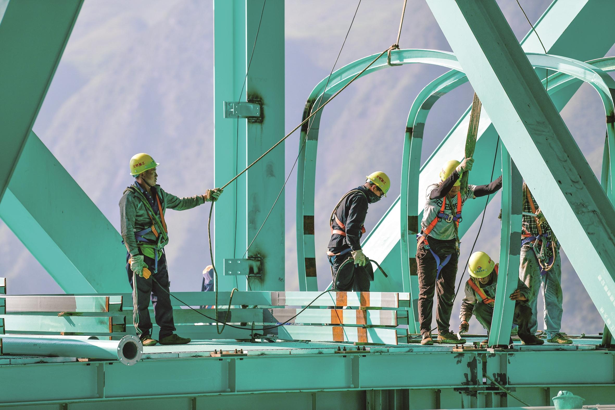 6月11日,工程建设者正在为在建的世界第一高桥——花江峡谷大桥安装观景长廊、玻璃栈桥式餐厅、极限运动设施等桥旅融合项目设备。花江峡谷大桥是贵州六安高速公路的控制性工程,全长2890米、桥面距水面高625米,预计今年下半年建成。新华社记者 杨文斌 摄