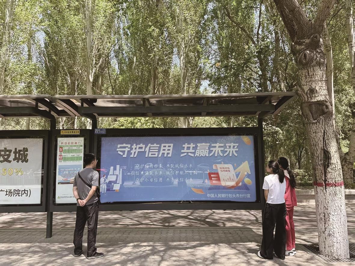 主题海报“广触达”。中国人民银行包头市分行围绕征信宣传主题,精心设计制作公交站牌主题海报。海报内容涵盖“征信修复”乱象治理、征信查询、企业资金流信用信息共享平台介绍等征信知识,将海报张贴在人流量密集的公交站牌,吸引过往行人的关注。同时,组织各金融机构通过公众号、网站、短视频平台等新媒体开展宣传,扩大宣传范围,营造了浓厚的征信宣传氛围。