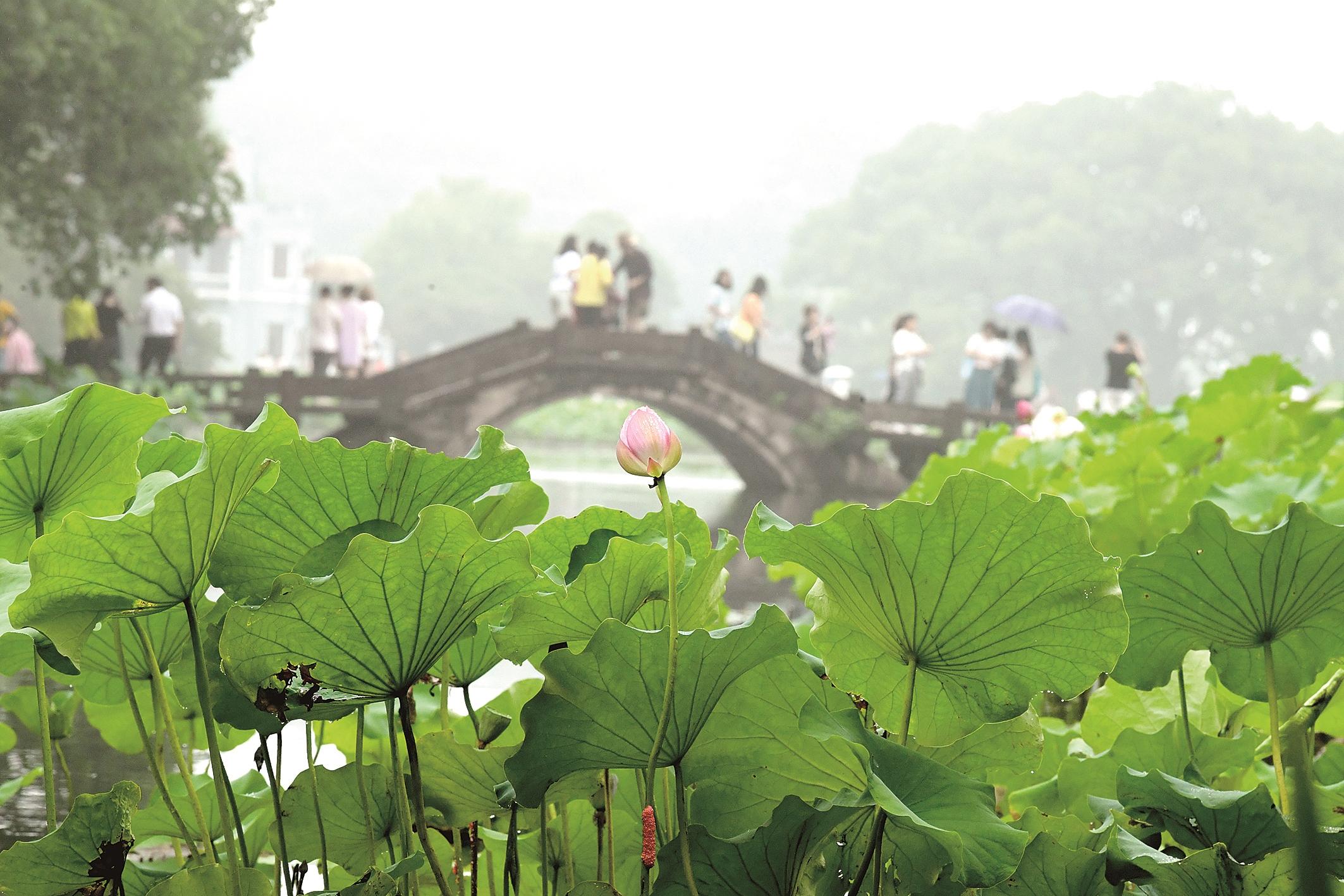 6月24日,人们在曲院风荷景区赏荷。