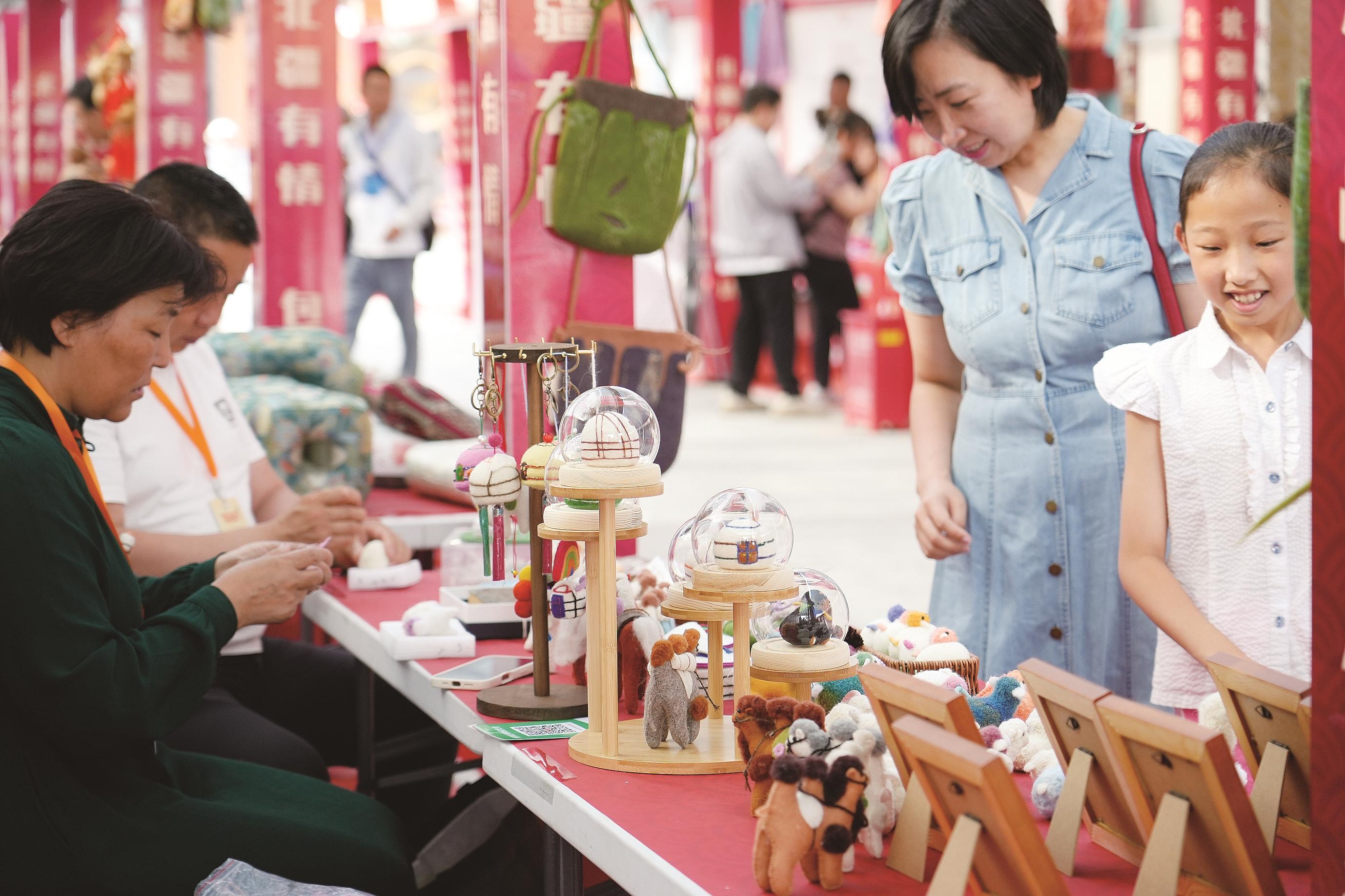 蒙古族马具制作技艺传承工作者赵菊花表示:“文创市集不仅让我们的技艺被看到,还让我们有机会与其他非遗传承人交流。”她刚与羊皮画传承人探讨完创作心得,直言收获颇丰。