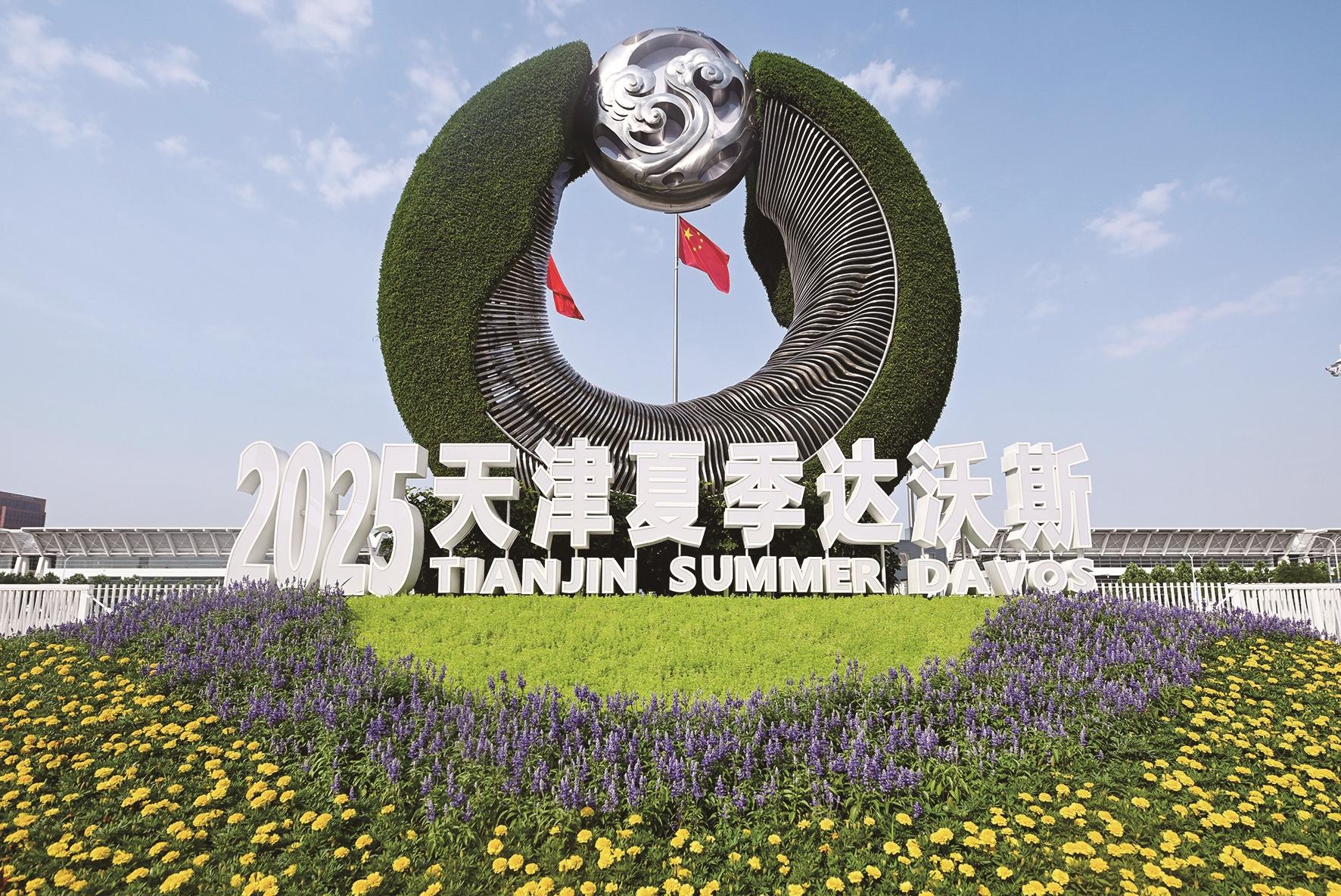 6月25日在国家会展中心(天津)外拍摄的2025年夏季达沃斯论坛主题花坛。新华社记者 赵子硕 摄