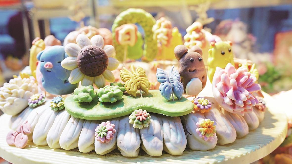 走进阿嘎如泰苏木乌兰计五村的花馍制作工坊,浓郁的麦香扑面而来。案板上,五彩斑斓的花馍宛如艺术品,粉嫩的寿桃缀着绿叶,金黄的鲤鱼鳞片分明,每一道褶皱都流淌着巧思。48岁的村民苏瑞萍以果蔬汁调色,用一双巧手将寻常面团捏成绽放的牡丹、憨态可掬的福兔,蒸腾的热气里,传统面食被赋予吉祥的魂魄。“从前蒸花馍就是图个喜庆,现在成了咱的‘金馍馍’!如今,钱包鼓了,腰杆直了,日子越过越红火。”捧着刚出笼的锦鲤花馍,苏瑞萍笑得合不拢嘴。