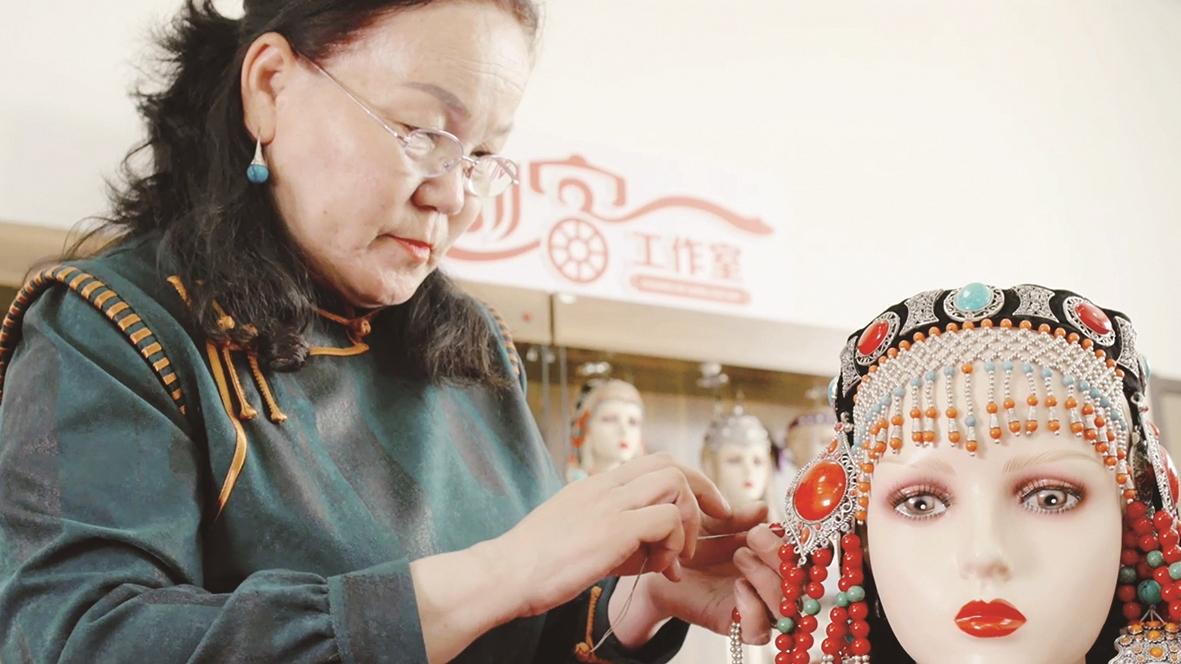 与此同时,非遗赋能的成果在社区也结出了累累硕果。在九原区沙河街道,非遗代表性传承人王飞龙定期走进花园社区,为居民传授掐丝镶嵌宝石画技艺。工作台上,金丝勾勒出细腻的纹样,各色天然宝石碎片在光线下熠熠生辉,拼贴成栩栩如生的草原风光。“以前觉得这是高不可攀的艺术。”学员李阿姨边小心翼翼地上色边说:“现在跟着王老师学,才发现我们也能创作出这么精美的作品。”