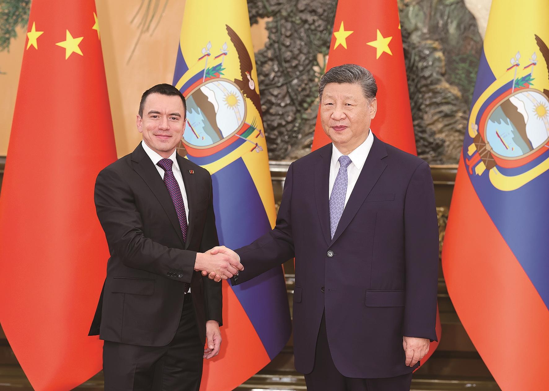 6月27日上午,国家主席习近平在北京人民大会堂会见来华出席夏季达沃斯论坛的厄瓜多尔总统诺沃亚。 新华社记者 黄敬文 摄