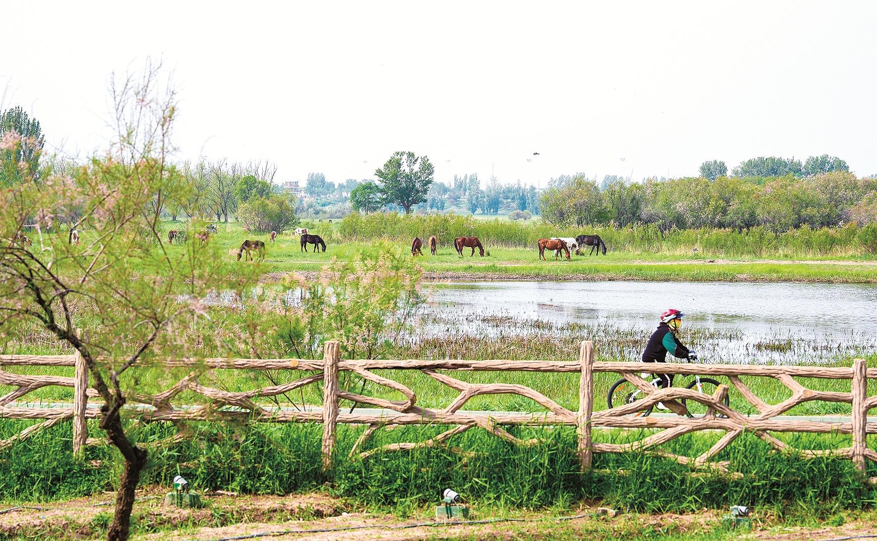 夏日清晨,赛汗塔拉城中草原在微光中苏醒。澄澈的湖边,马儿悠然低头吃草,不远处,骑行爱好者正沿着健身步道穿梭。草原晨韵,活力无限。记者 李强 摄
