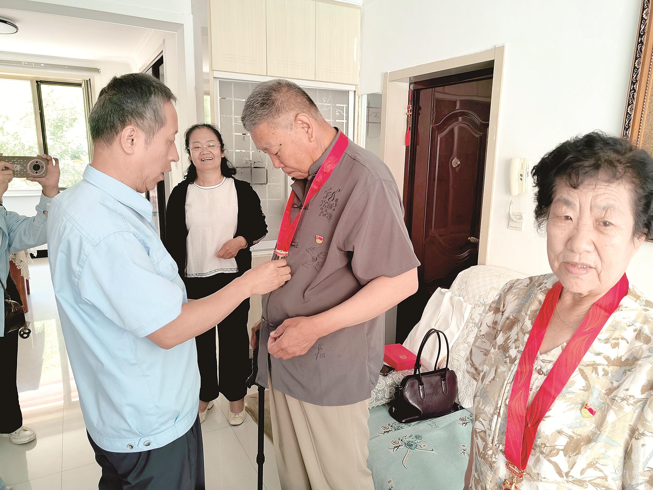 为老党员佩戴纪念章。