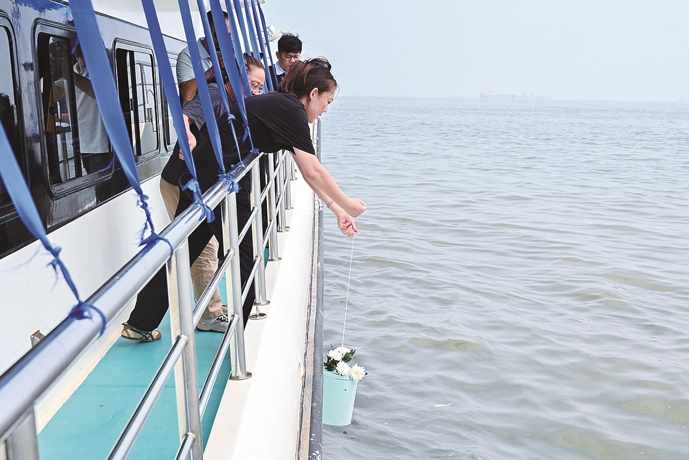 航程中,船上播放乐曲轻柔委婉,工作人员向家属讲解海葬注意事项,并对逝者表达尊重,全体人员为逝者致哀。当船只抵达指定海域后,家属在工作人员的指引下,将存有骨灰的降解罐缓缓放入大海,随后抛撒鲜花,让思念随波远航。
