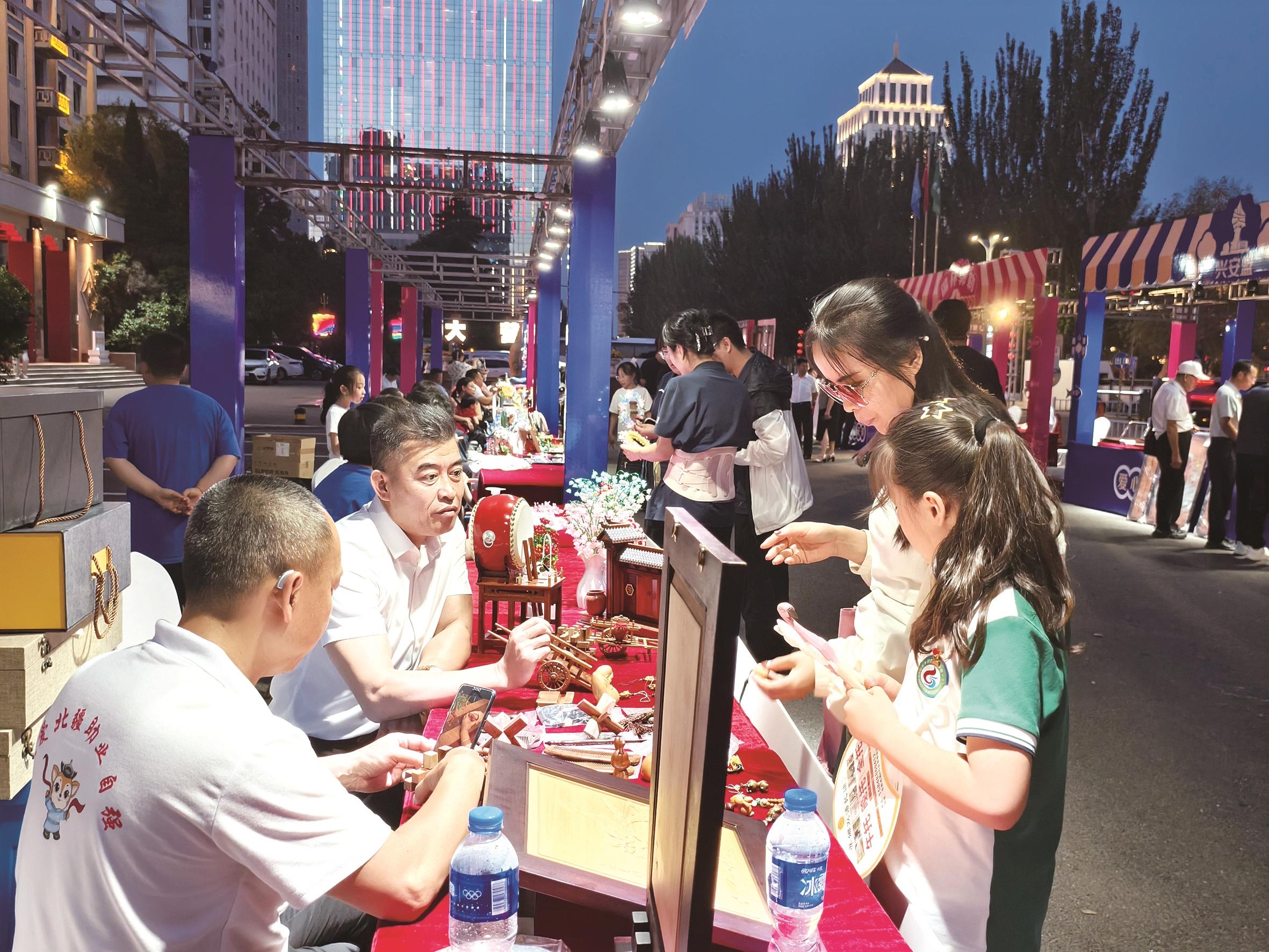夜幕低垂,华灯初上,集市现场逐渐热闹起来。漫步展区,12个盟市展位依次排开,非遗年画、古风饰品、黏土摆件、手工团扇、羊毛毡等手工艺品琳琅满目,空气中还飘散着醋的醇香。这些精巧绝伦的产品不仅吸引了众多市民驻足欣赏,更赢得了大家对残疾人精湛技艺和创业精神的由衷赞叹。