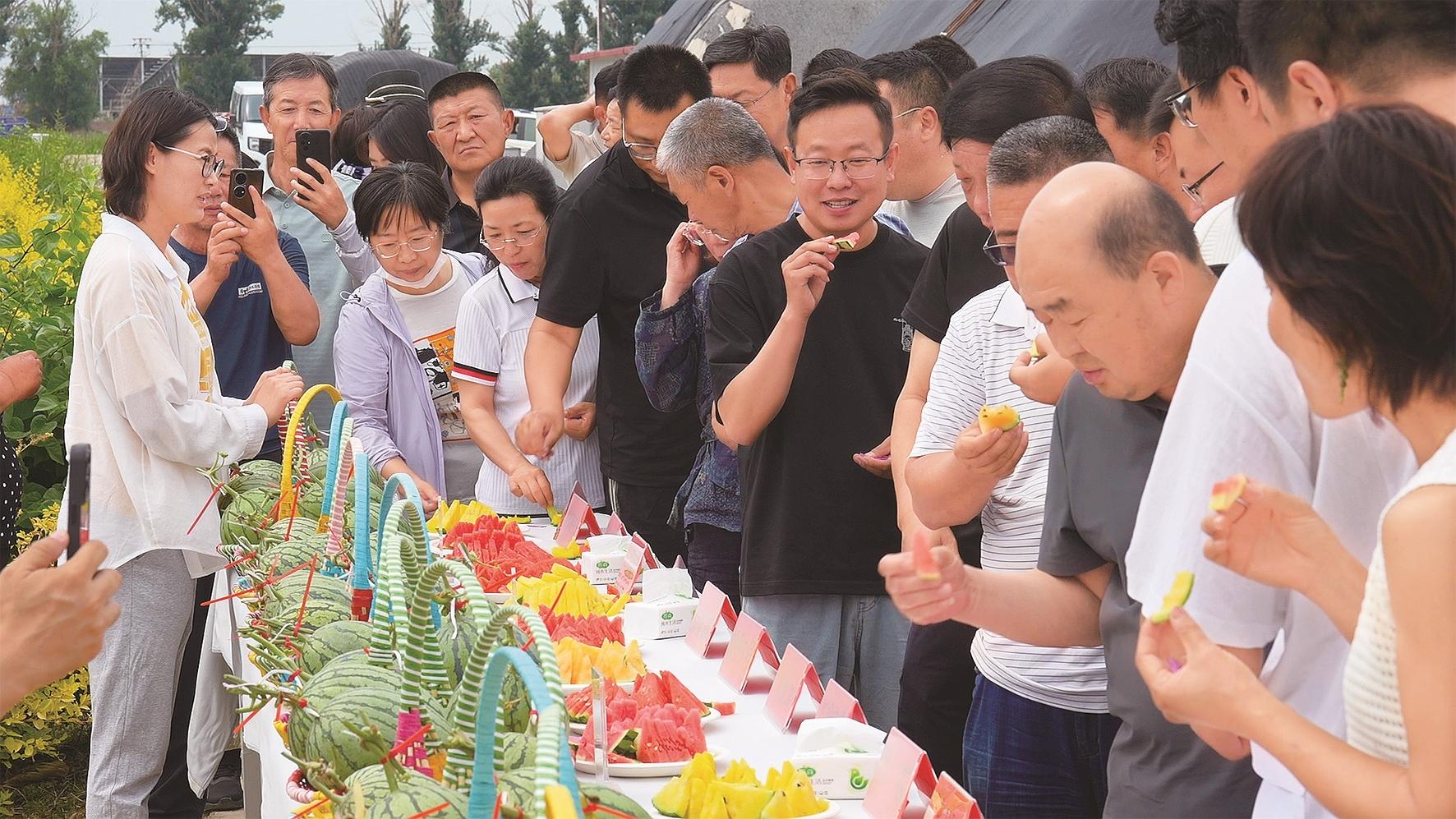 大棚旁的品鉴区气氛热烈,30余款西瓜、甜瓜新品种切片陈列,与会成员仔细观察瓜皮纹路、光泽,品尝果肉质地与风味,进行综合评价。瓜香四溢中,交流互动热烈。“这场观摩会搭建了一个宝贵的合作平台,让大家了解到周边城市也能培育出如此优质的品种。”来自鄂尔多斯市的满世集团健康食品事业部总经理屈跃表示,这样的方式可以让他们能便捷地选育更多新品种,学习先进栽培技术,有效提升自身西甜瓜品质。