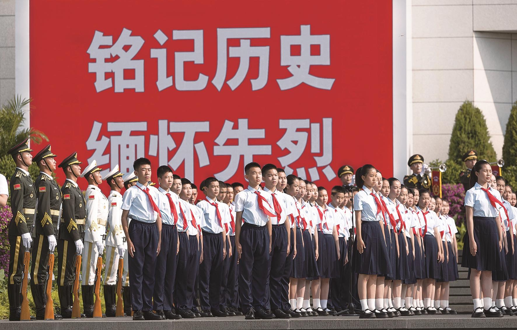 北京卢沟桥畔,中国人民抗日战争纪念馆庄严肃穆。上午9时,仪式开始。中国人民解放军军乐团奏响《义勇军进行曲》,全场高唱中华人民共和国国歌。随后,全场肃立,向在中国人民抗日战争中英勇牺牲的烈士默哀。