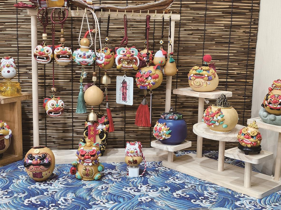 吕钒特别向记者展示了他的“福禄兽”系列冷瓷彩塑作品。阳光下,“福禄兽”憨态可掬,色彩鲜艳、充满传统元素。小小的葫芦上有着形态各异的瑞兽脸庞。它以醒目的红色、金色、蓝色等为主色调,面部装饰有复杂的卷云纹,凸显出精致的工艺。舞狮双眼大而圆,炯炯有神,嘴巴微张,露出洁白的牙齿,显得生动活泼。身体呈圆润的鼓形,上面刻有“福禄”二字与吉祥纹,寓意吉祥。四肢和耳朵等部位也装饰得十分可爱,整体造型既传统又富有创意。