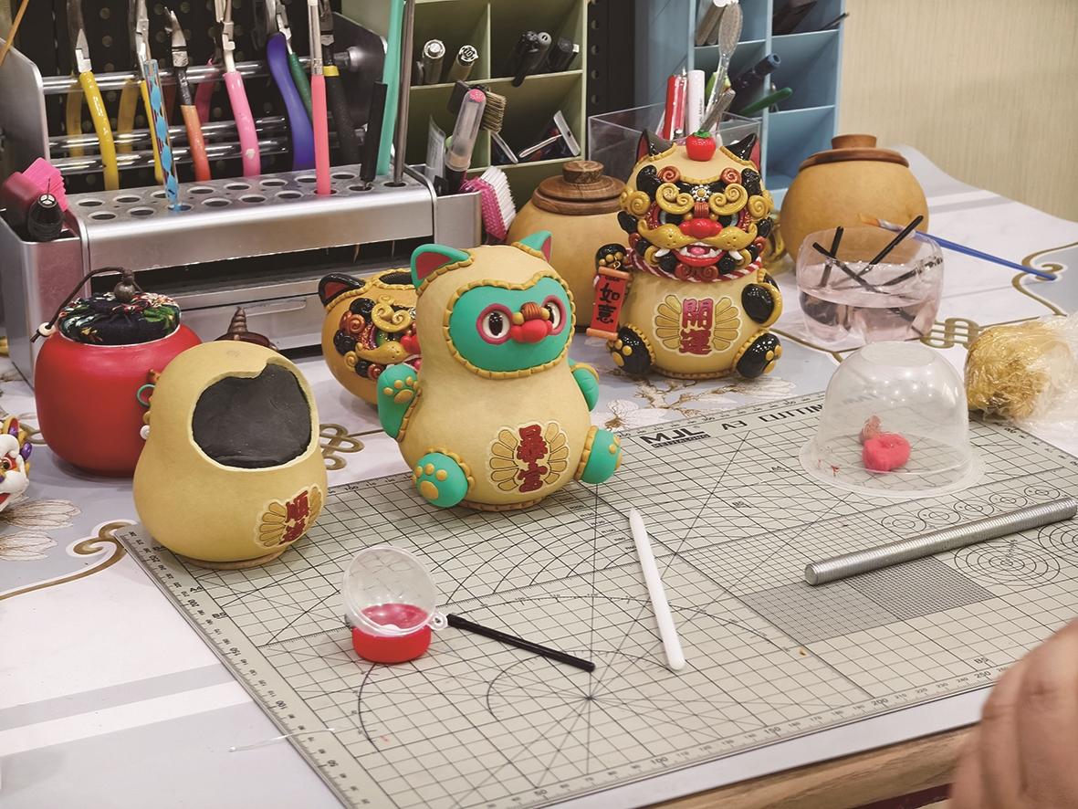 走进吕钒工作室,仿佛踏入了一个色彩斑斓、创意肆意流淌的梦幻空间。这里不仅是创意与艺术的汇聚地,更是传统与现代碰撞融合的一方天地。一进门,就看到展陈架上整齐排列的冷瓷彩塑作品以及与全国各地的手工艺人交换的手工作品。憨态可掬的“福禄兽”葫芦、威风凛凛的狮头摆件……无不展示着传统工艺的独特魅力,同时又散发出创新的蓬勃气息。