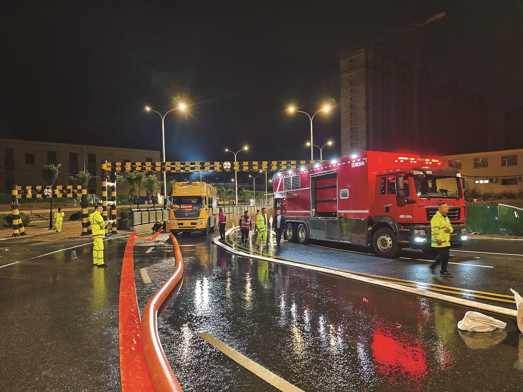 “建设路积水已没过轮胎,请求支援!”接到险情通报后,市水务集团再生水公司所属排管所应急抢险队赶到现场。队员们合力铺设排水管道,移动泵车开始抽排。当晚11时许,路口的积水基本退去,车辆可以顺利通行。