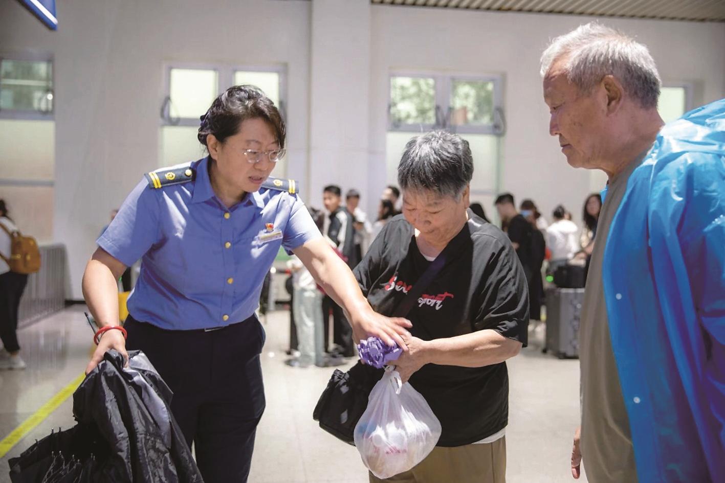 包头客运车间第一时间加派人手,为缓解出站口旅客滞留,组织出站旅客前往候车室避雨,同时密切关注老弱病残孕等重点旅客需求。在候车大厅和出站口,工作人员引导旅客有序进出,并加强与地方交通部门联系,组织公交车、出租车等车辆接驳。