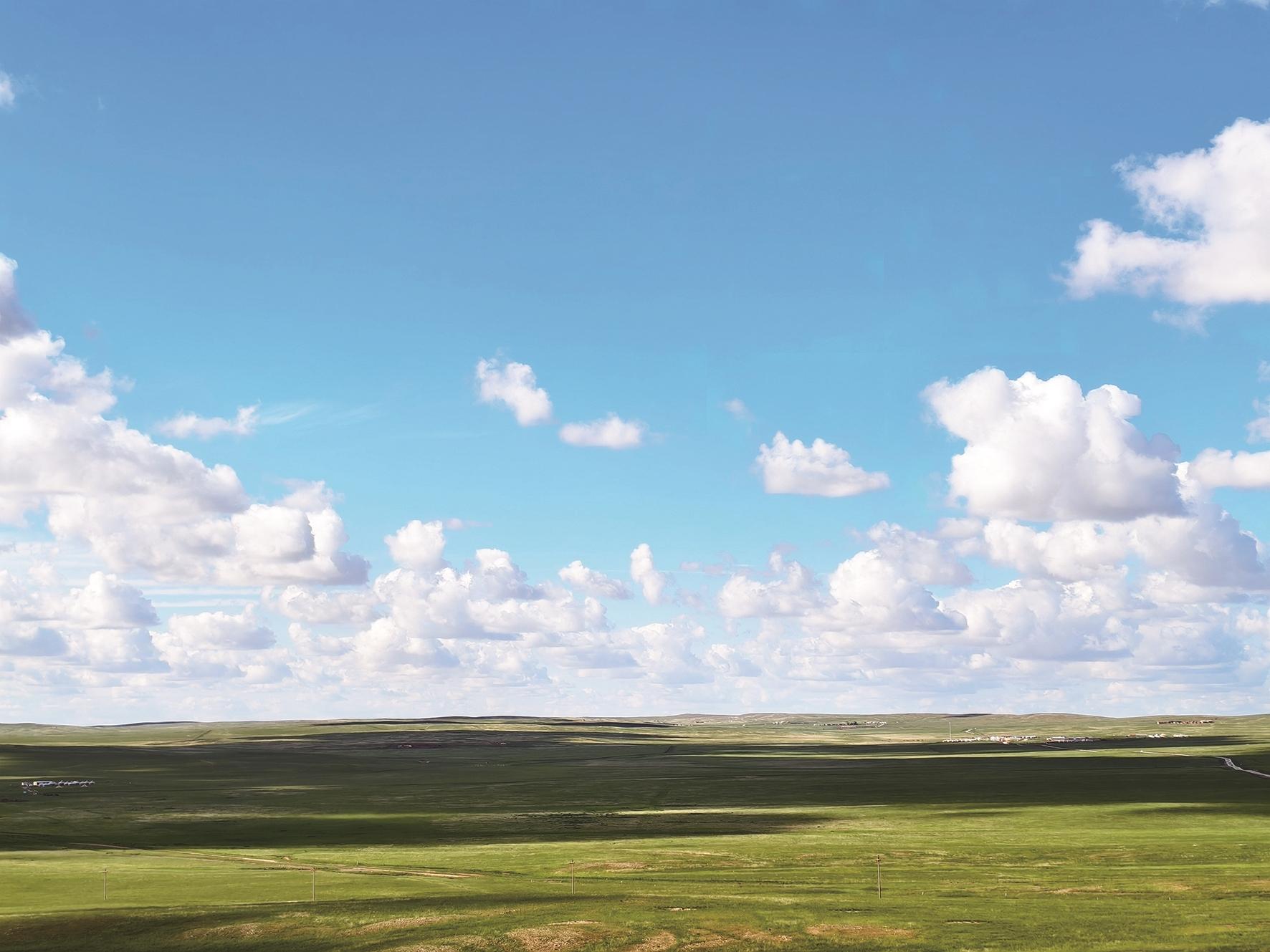 蓝天、白云、大草原。