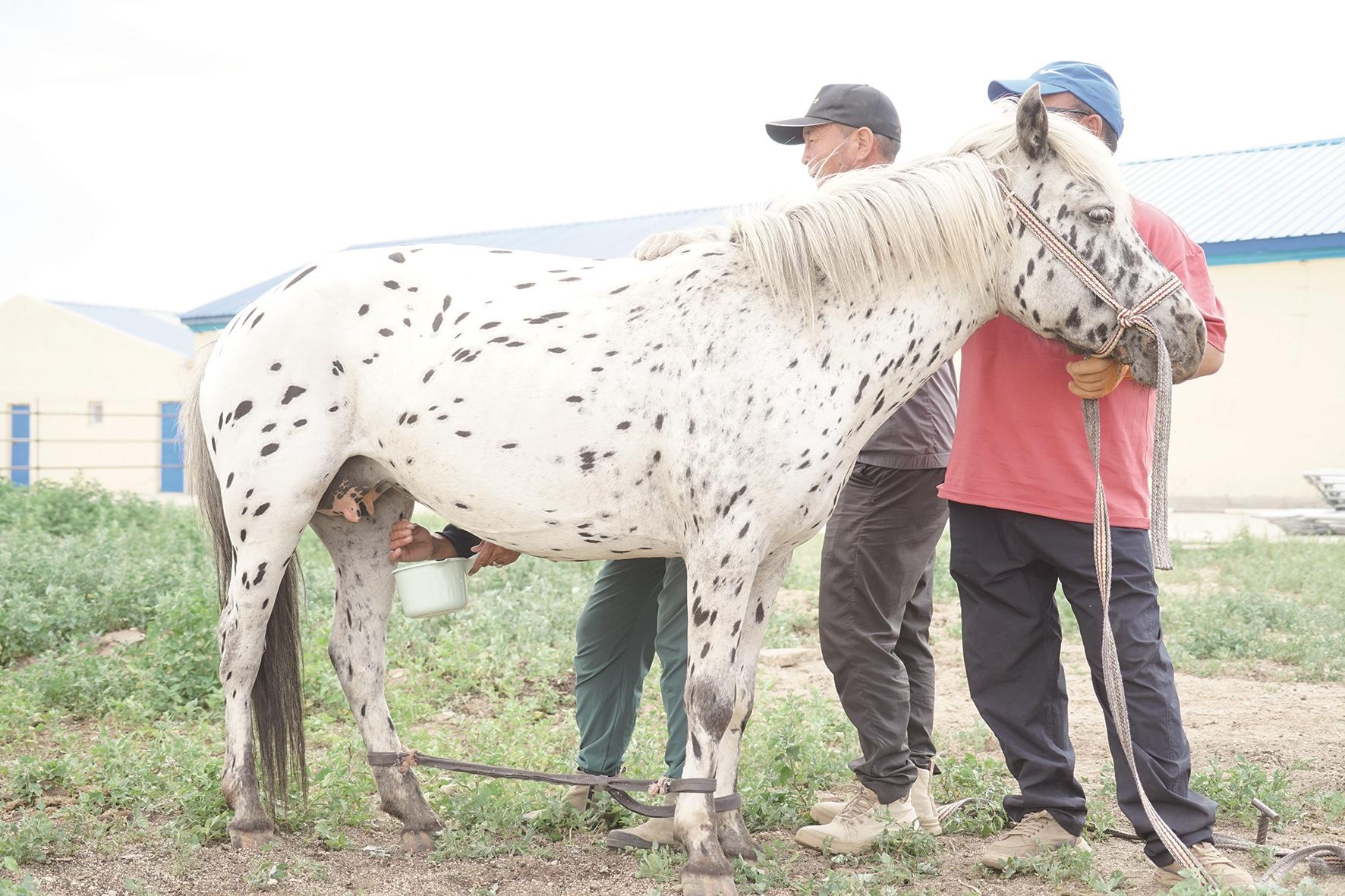 在达尔汗蒙古马保种(扩繁)基地,记者看到工作人员整装上阵,先进行小马驹套马训练,然后分工合作,安抚母马、绑好马绊,再进行挤奶,不到半个小时,一桶新鲜的马奶就已经挤完。工作人员迅速将鲜马奶送到生产车间进行储藏、制作策格。
