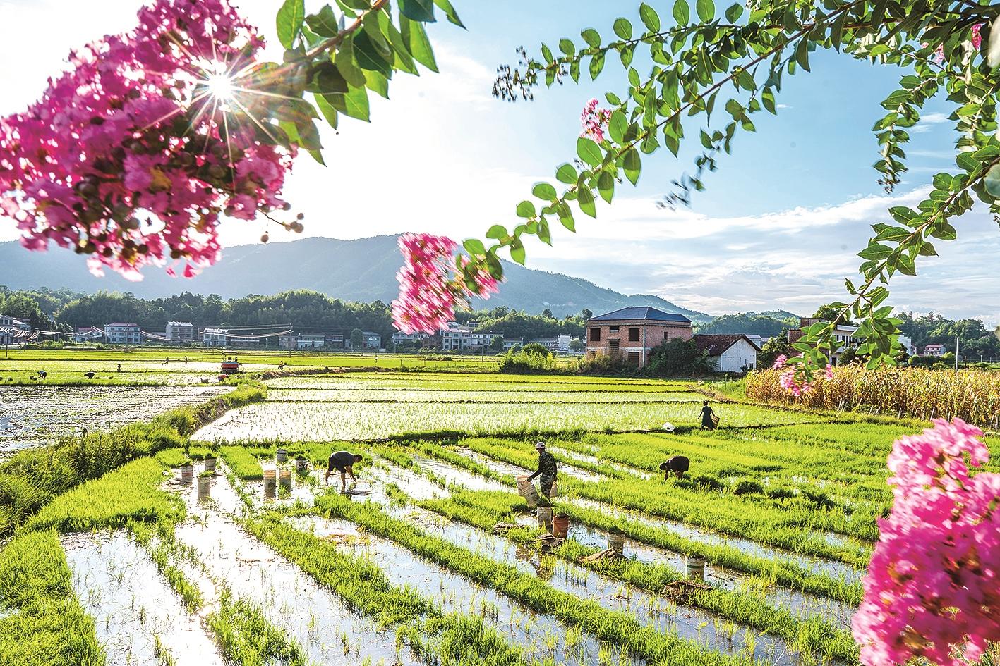 7月21日,农民在湖南省娄底市双峰县荷叶镇长塘村的田间插秧。