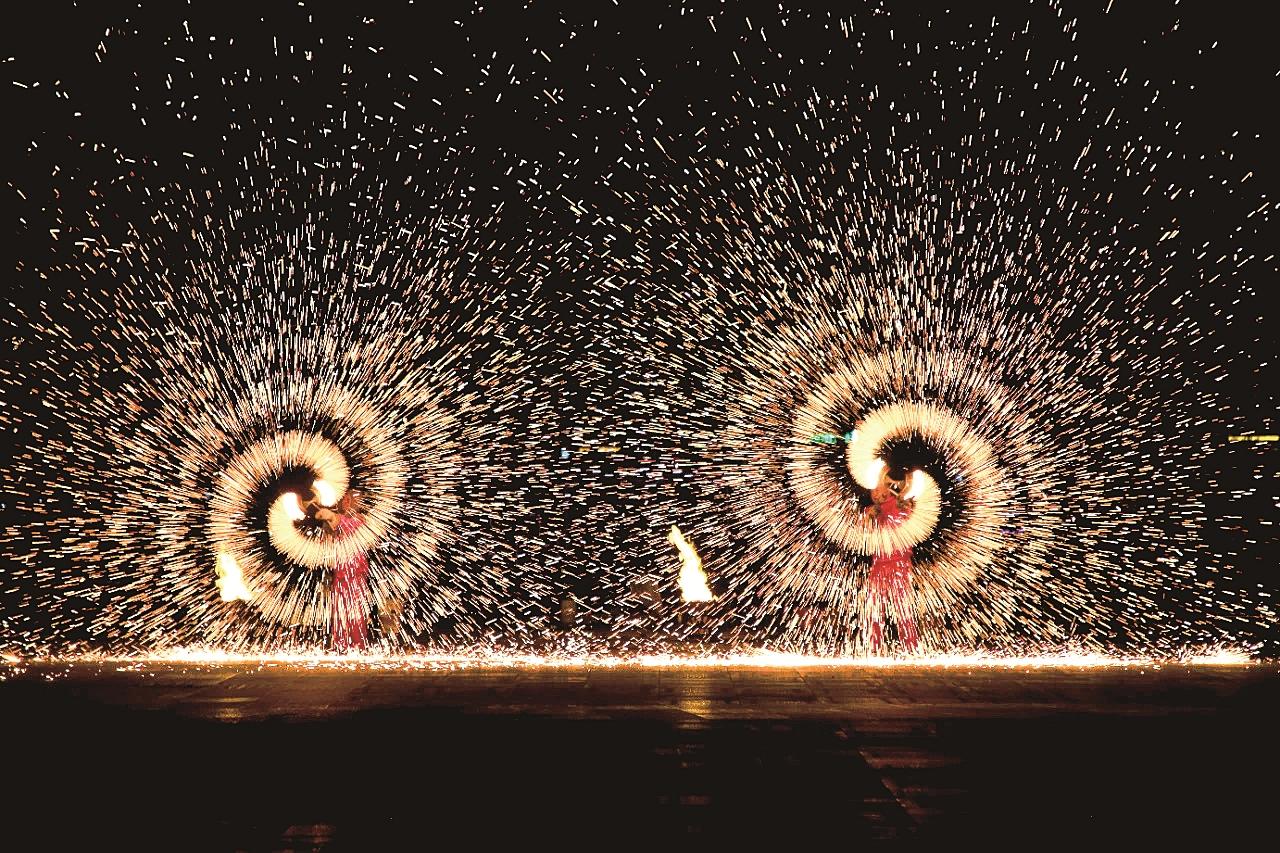 活动现场,“火壶、火棍、飞火流星、风火轮、打铁花”五大非遗绝技依次登场,各展风采。非遗代表性传承人迈着沉稳有力的步伐,火壶中的炽热炭火随之跳跃升腾,在夜幕中划出一道道流动的火线,瞬间点燃了全场观众的热情。紧接着,火棍与飞火流星的精彩表演将现场气氛推向了高潮,其惊心动魄的技艺让观众惊叹连连。