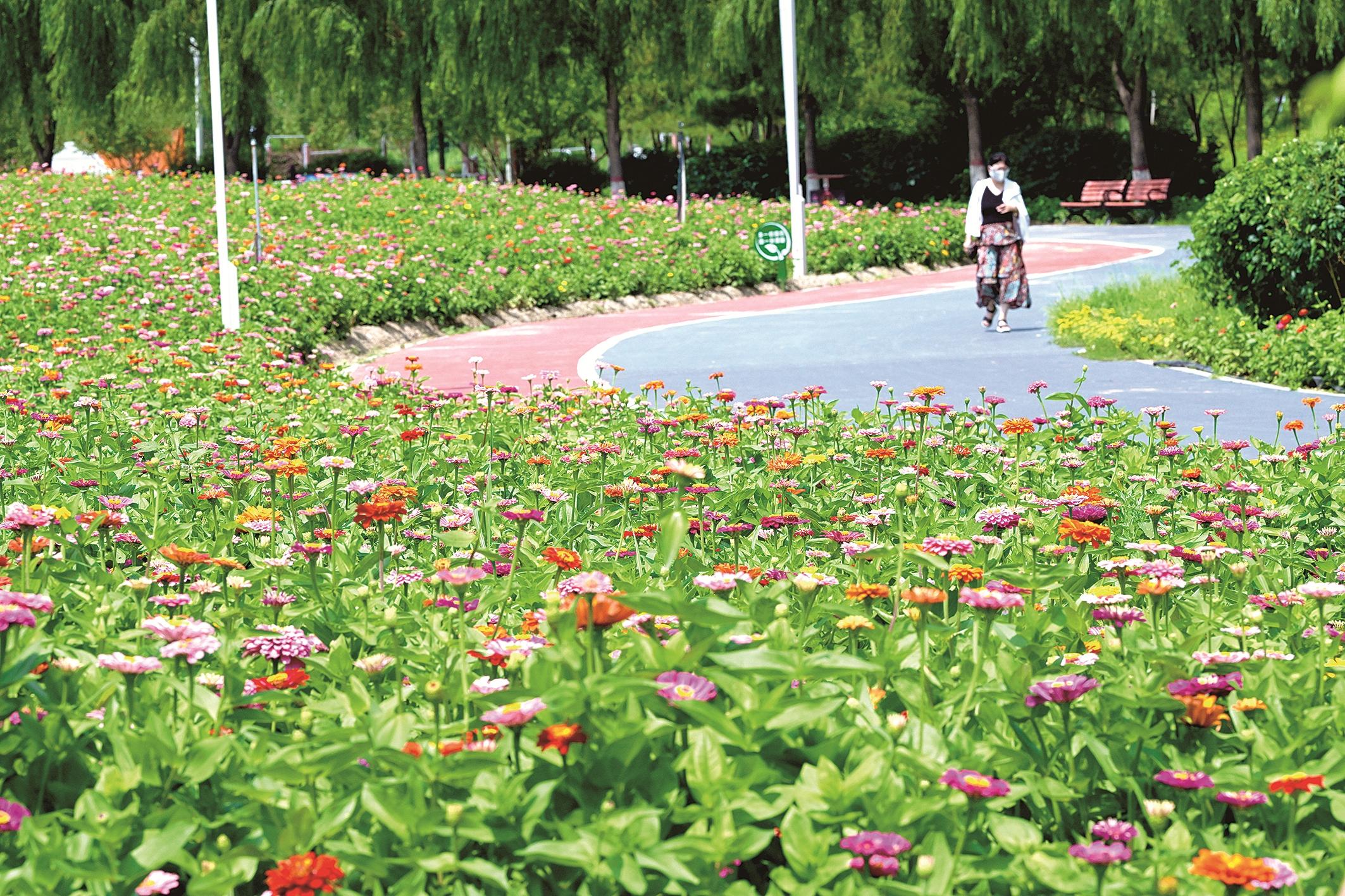 7月28日,九原区台地公园内小丽花等花卉竞相绽放,织就绚烂花海,市民漫步其中,感受诗意与浪漫。我市持续推进城市绿化建设,让市民在家门口尽享生态之美。记者 李强 摄