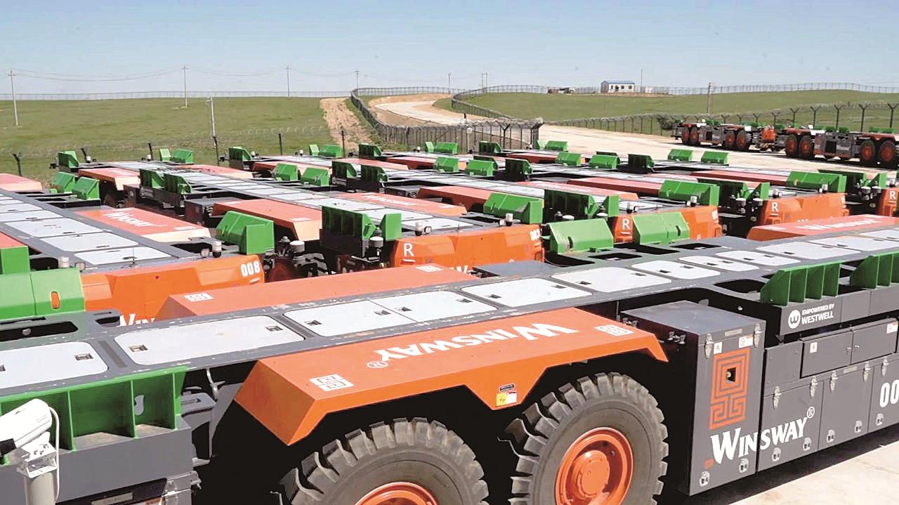走进项目建设现场,映入眼帘的是一派热火朝天的施工景象。数十台工程机械在工地上有序运转,挖掘机挥舞着钢铁臂膀,起重机吊装着钢构件,混凝土泵车正在浇筑地基。不远处,10台崭新的AGV无人驾驶运输车整齐排列在专用停车区,车身在阳光的照射下泛着金属光泽,这些代表着“智慧口岸”建设成果的智能运输设备蓄势待发,仿佛一支“钢铁驼队”,只待投入到中蒙跨境物流的大通道建设中。
