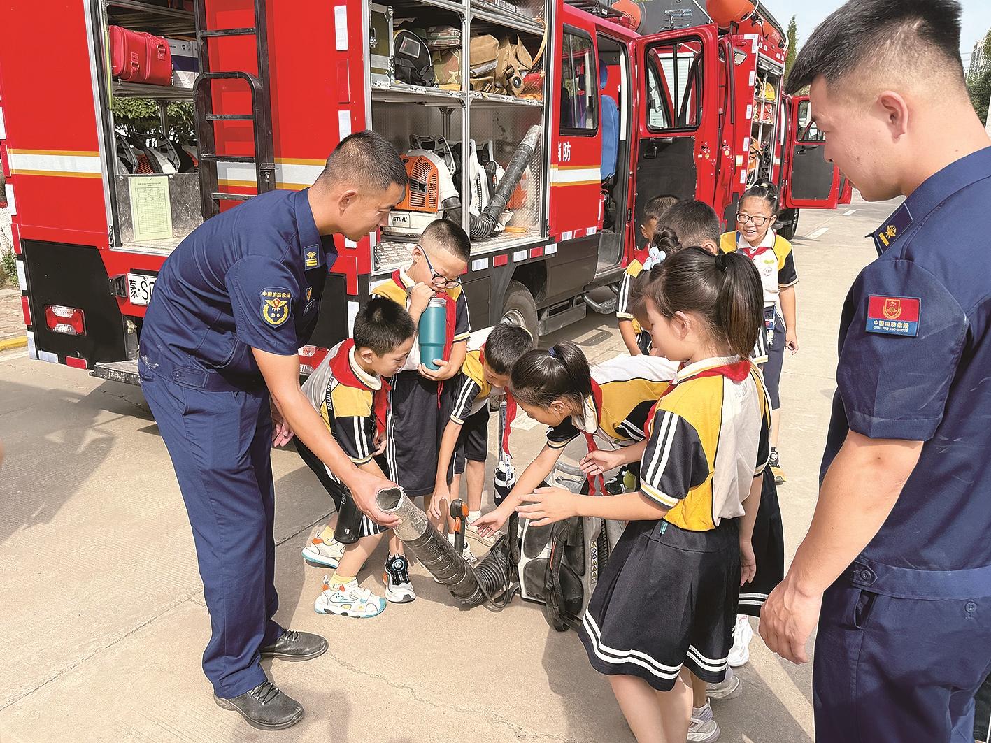 走进消防队,一辆辆鲜红的消防车率先映入眼帘,指战员秒变“科普老师”,围绕消防车的类型、功能展开细致讲解,各类消防器材在他们手中仿佛“活”了起来。这种“互动问答+实操展示”的模式,精准契合学生们的认知特点,让消防知识的传递变得既轻松又深刻。