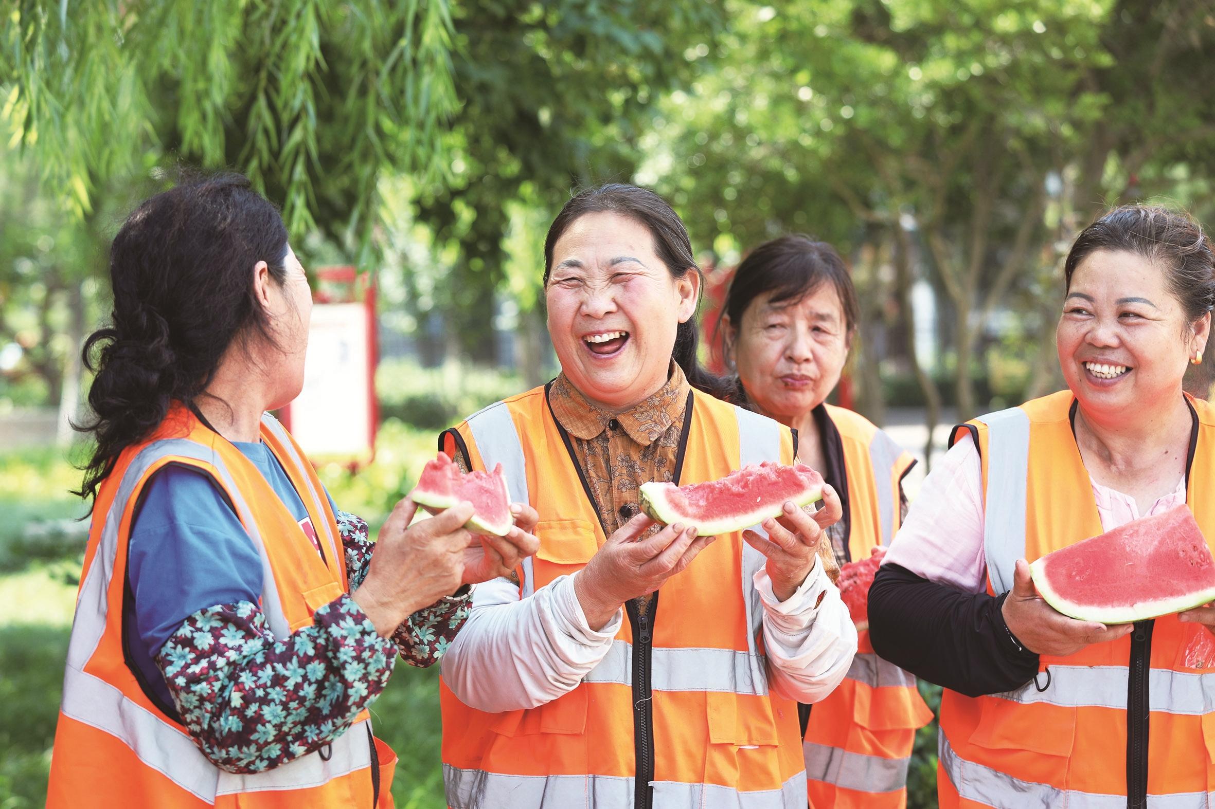7月22日,河北省唐山市丰润区环卫工人分享志愿者送来的西瓜。