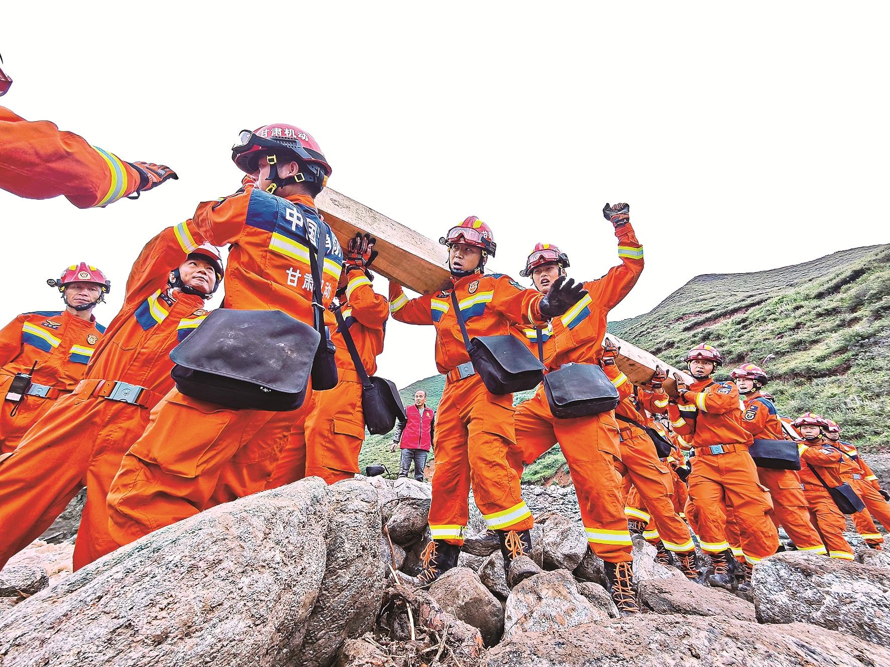 8月9日,甘肃省森林消防总队消防员在榆中县马坡乡旧庄沟村沿河道搜寻被困人员途中搭建临时木桥。