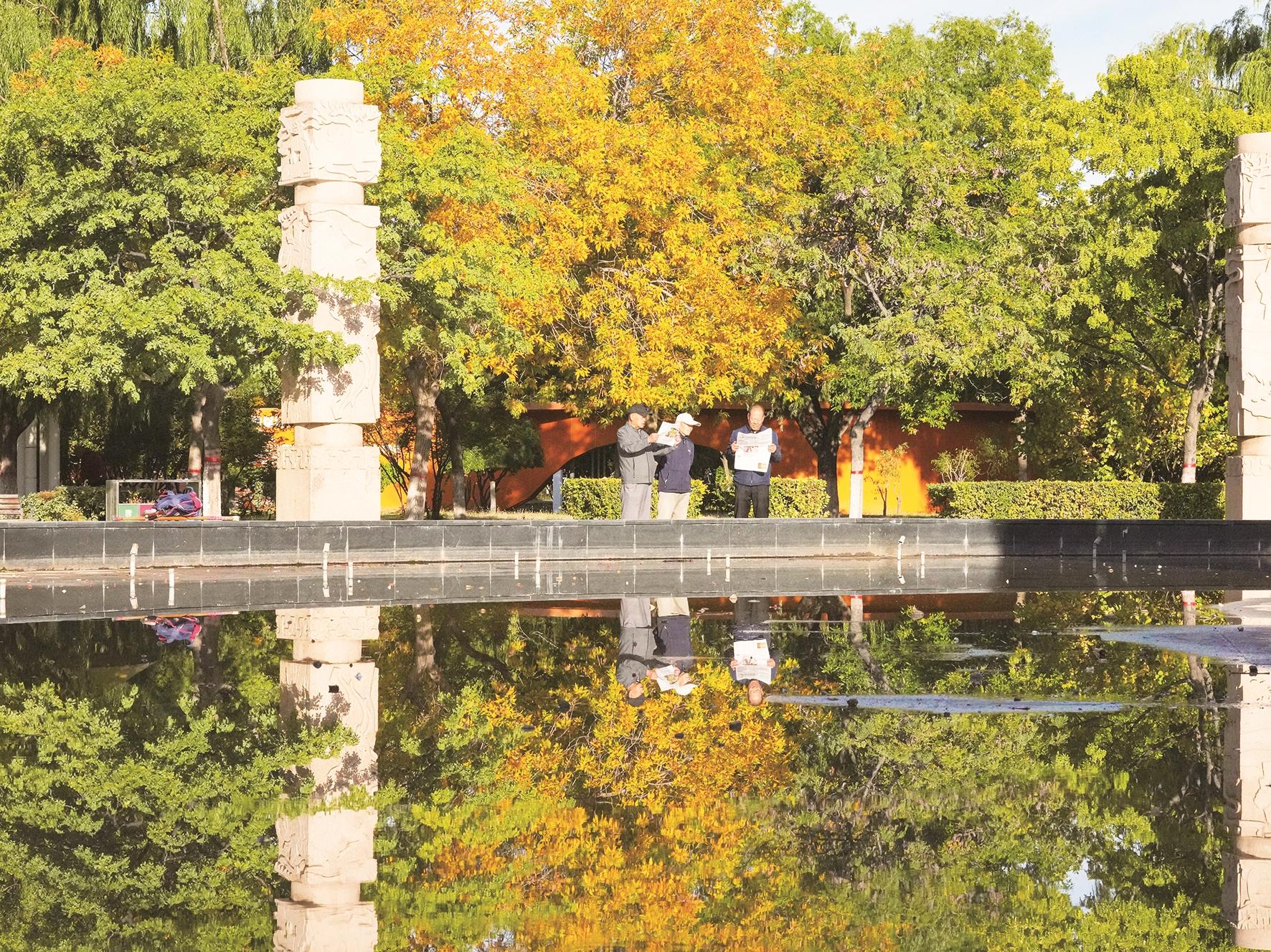 10月11日清晨,法治公园的水面倒映着斑斓秋色,游人在朝阳中流连忘返。这一幕,构成了一幅和谐悦人的画卷。