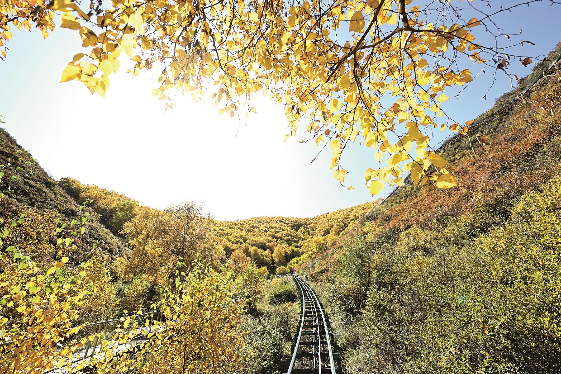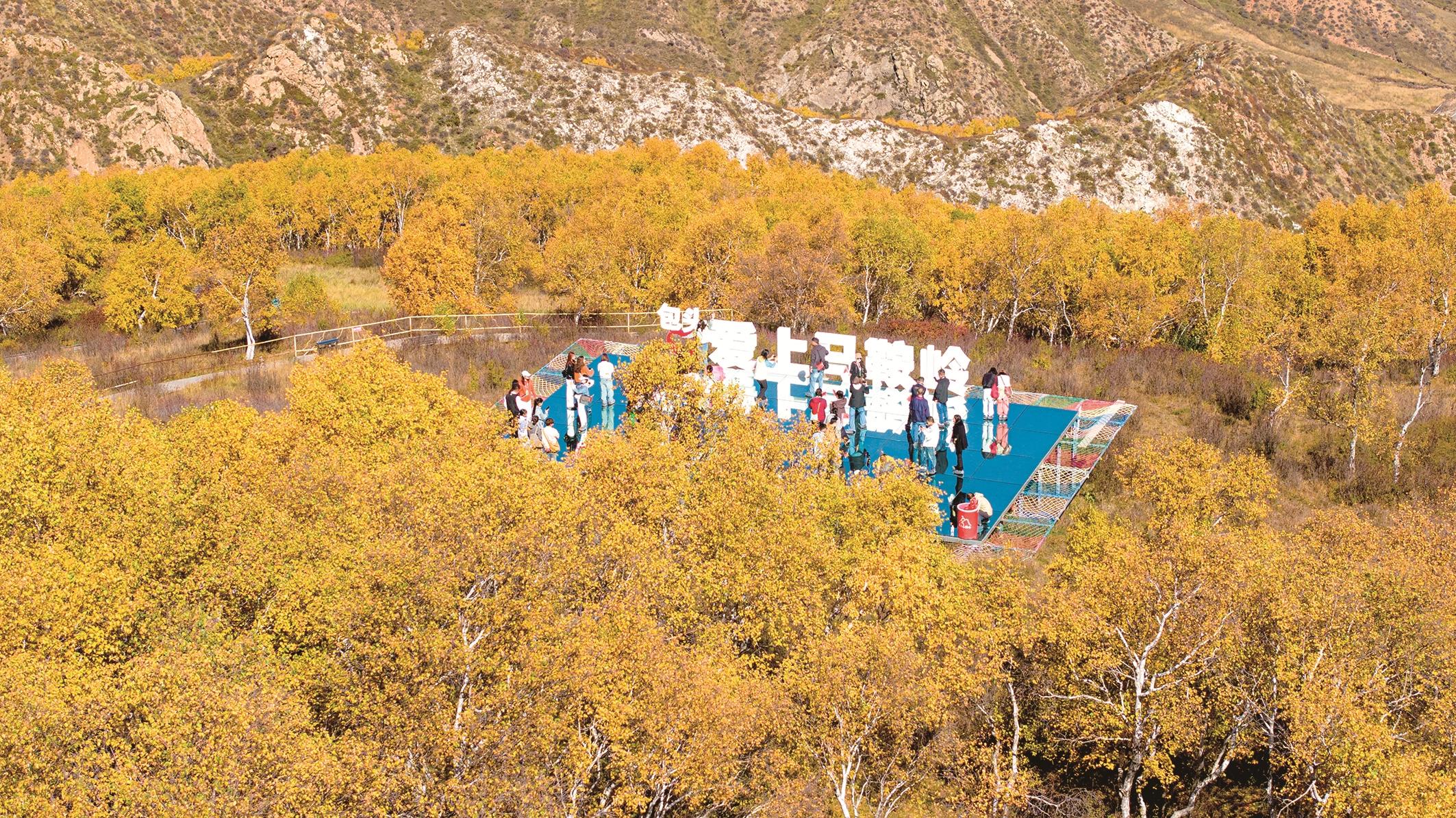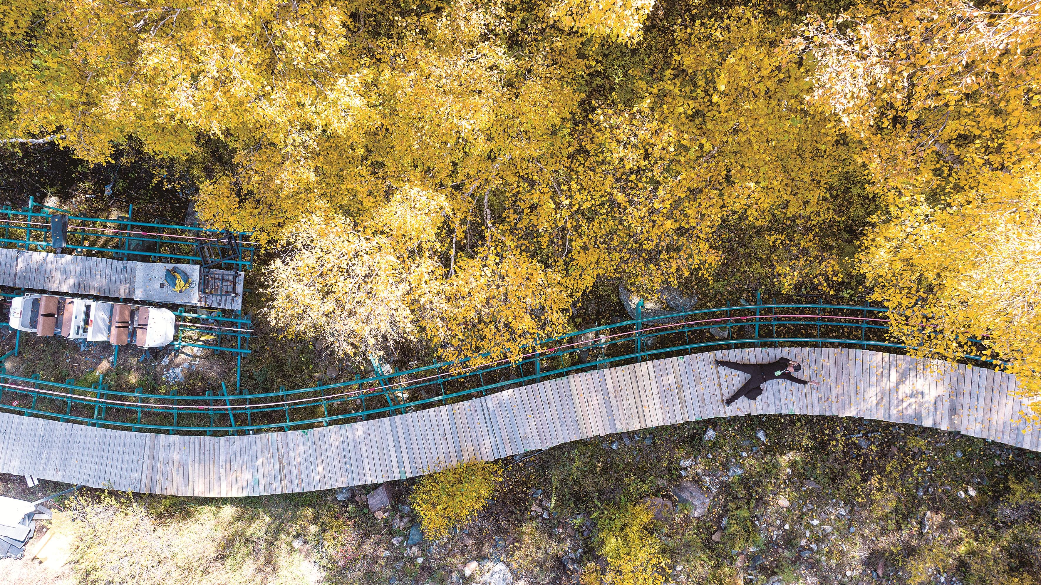 沿着山间步道拾级而上,白桦林中,阳光透过枝叶洒下的斑驳光影与飘落的秋叶共舞。登上海拔1984米的马鞍山主峰,极目远眺可见阴山山脉横亘,北坡的桦树林黛色茫茫,南坡则金光闪耀,美若画卷。