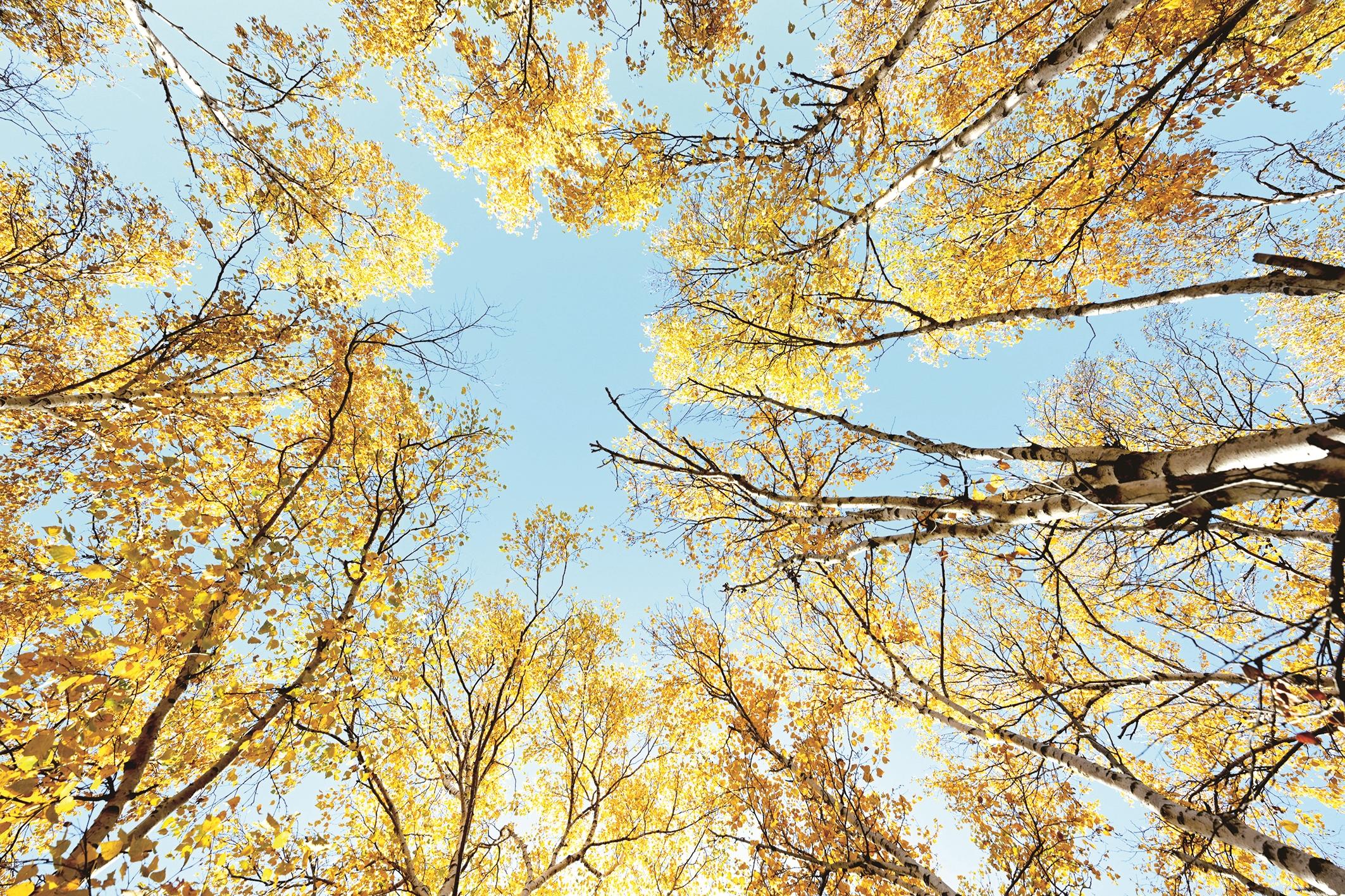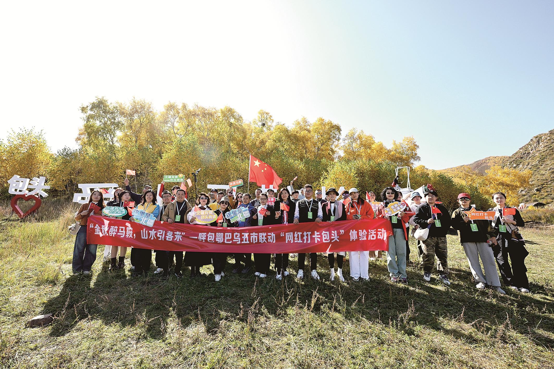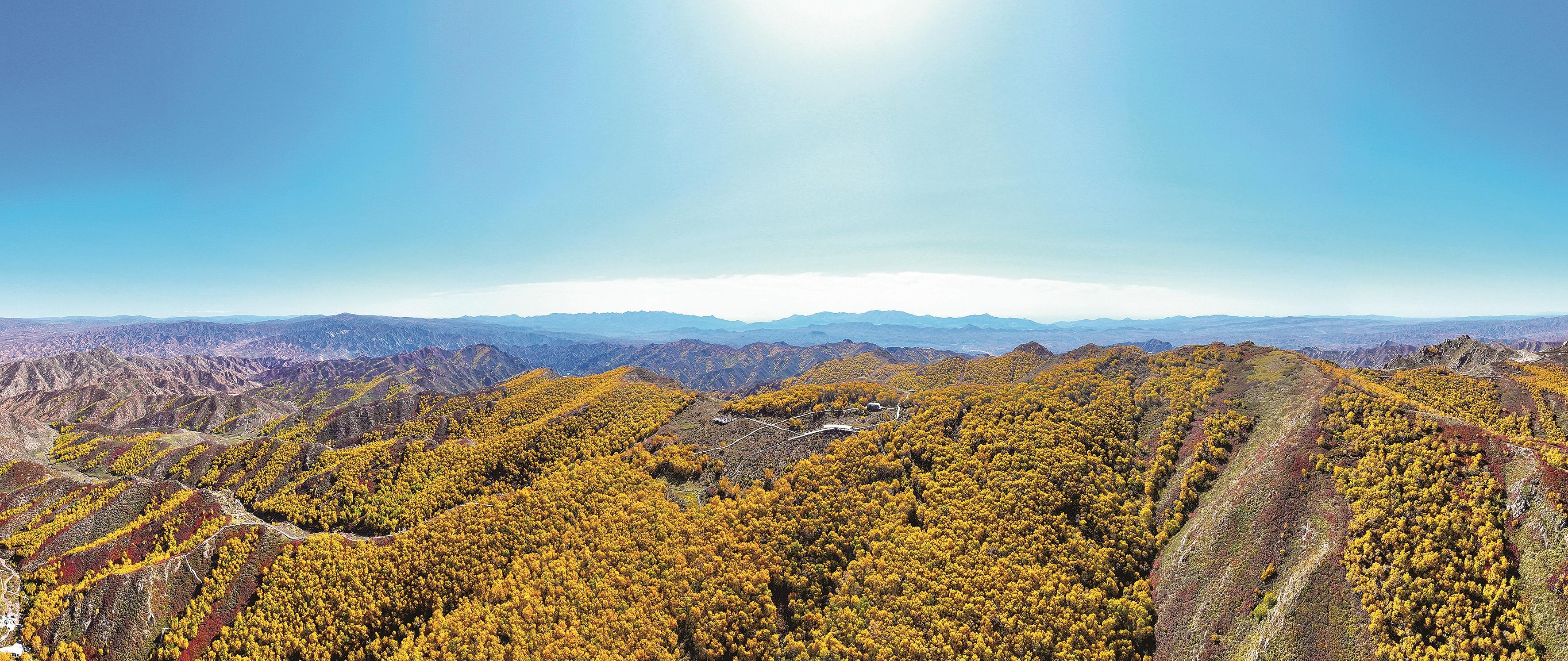 沿着山间步道拾级而上,白桦林中,阳光透过枝叶洒下的斑驳光影与飘落的秋叶共舞。登上海拔1984米的马鞍山主峰,极目远眺可见阴山山脉横亘,北坡的桦树林黛色茫茫,南坡则金光闪耀,美若画卷。