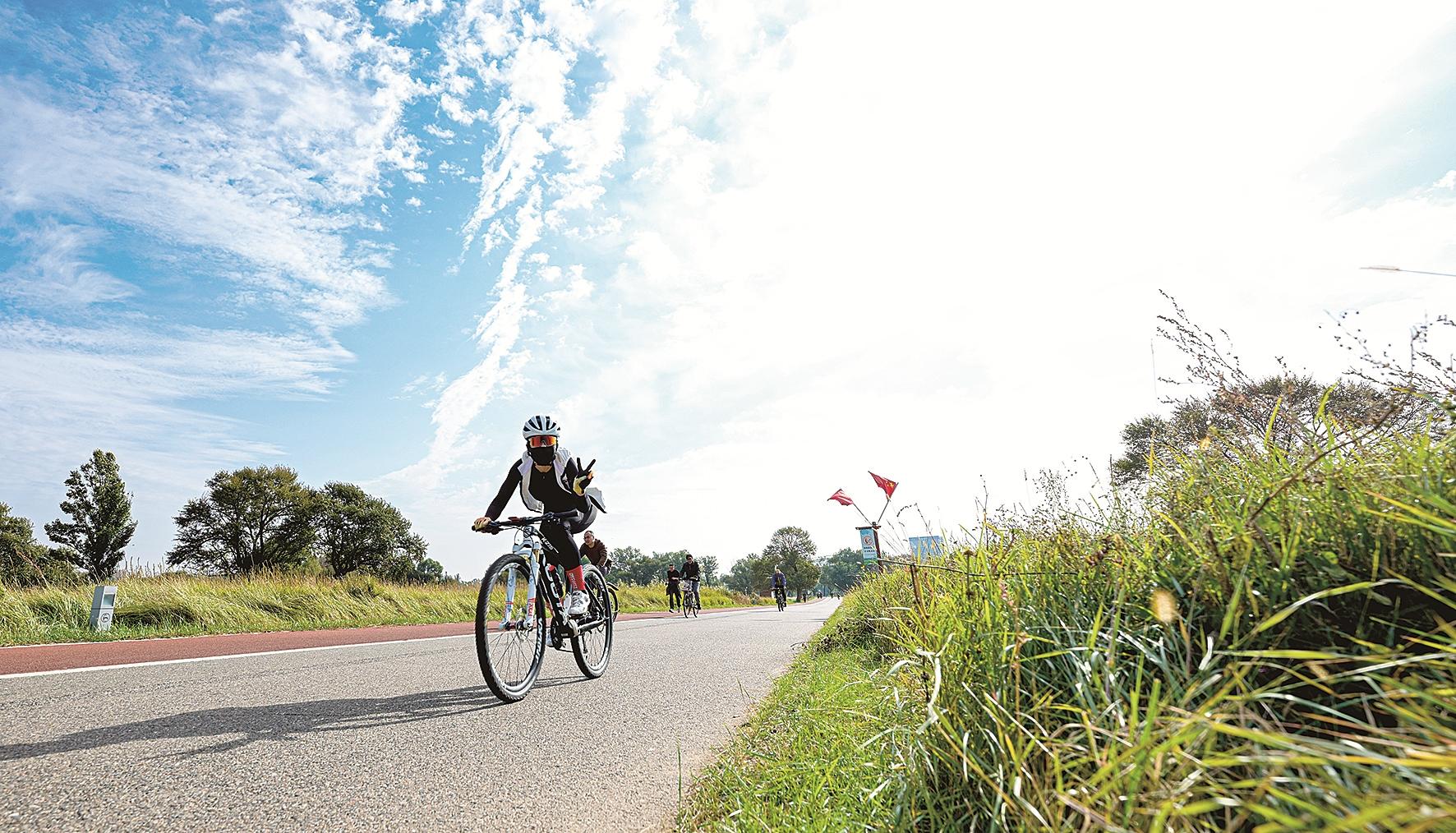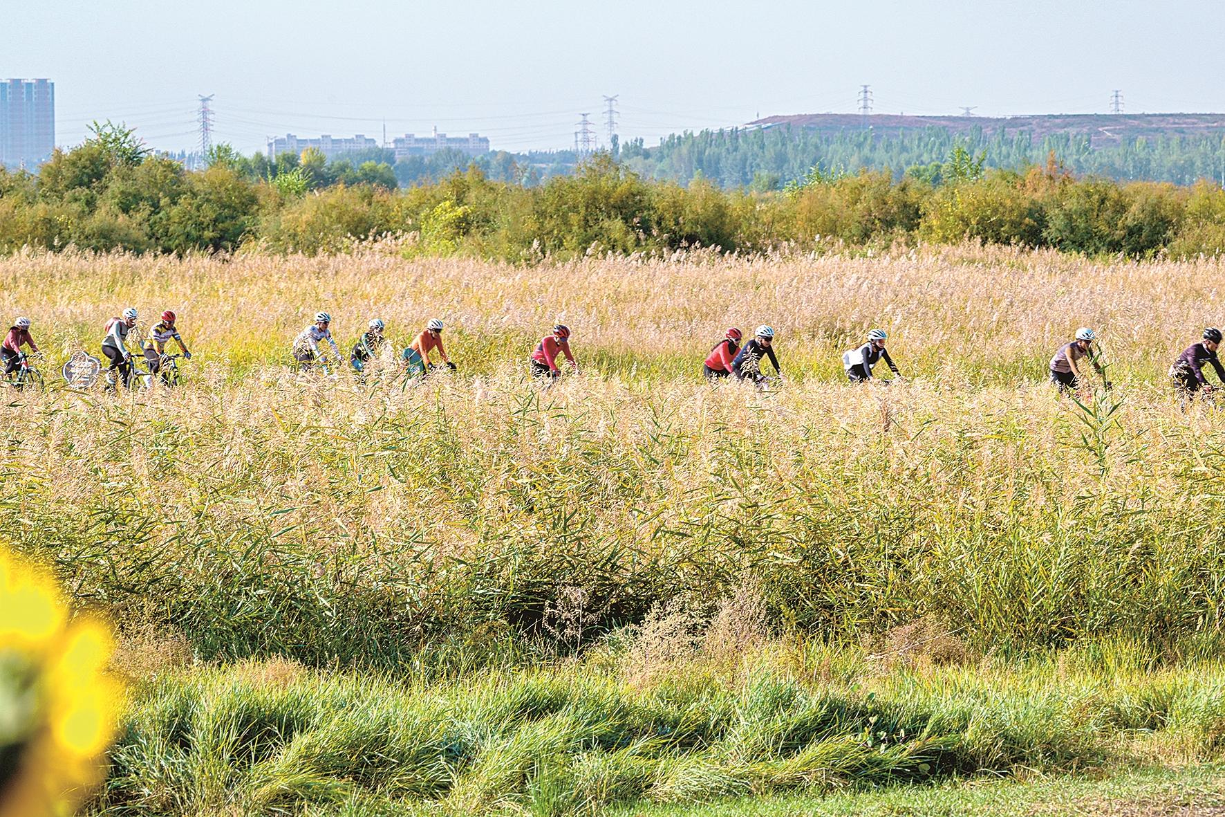 金黄的芦苇荡间,骑行爱好者们欢快驶过。