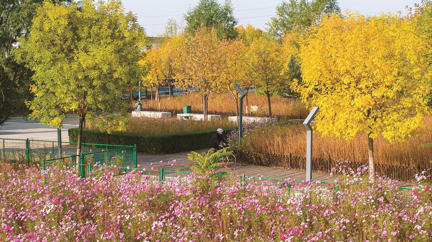 10月14日,昆都仑河国家湿地公园,格桑花海在秋风中摇曳,与金黄的秋叶相映成趣,宛如一幅五彩斑斓的水彩画。
