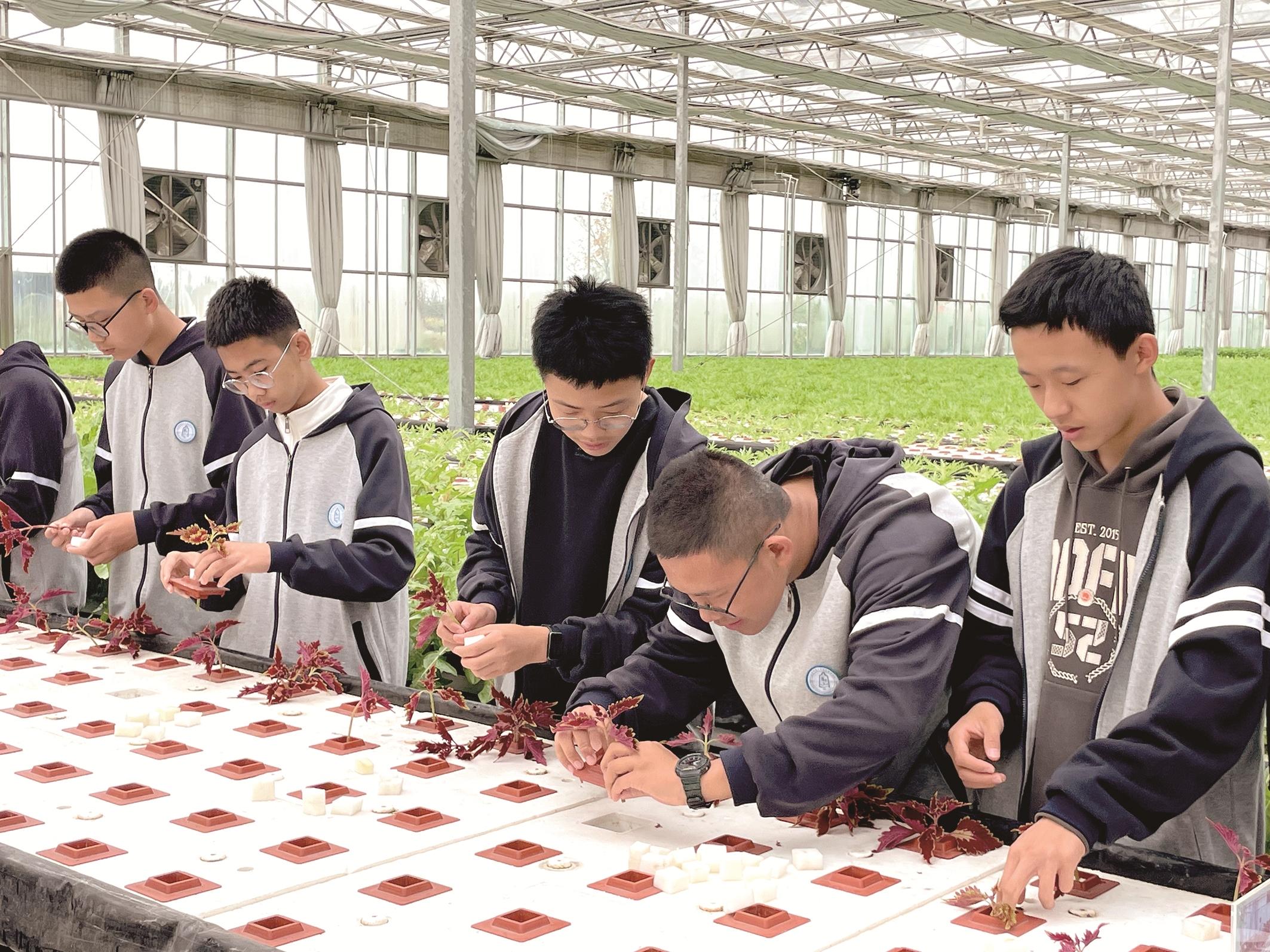作为本次研学的首站,土右旗现代农业博览园为同学们展示了现代科技农业的生动图景。在立体无土栽培展示区层层叠叠的栽培架前,蔬菜与花卉在营养液中茁壮成长。在叶菜水培区,讲解员介绍了无土栽培与水培和传统土培的区别,学生们认真聆听、踊跃提问。在随后的实践环节中,大家在技术人员指导下分组进行无土栽培操作,从固定植株到配制营养液,每一步都严谨细致,将课堂所学转化为亲手实践。