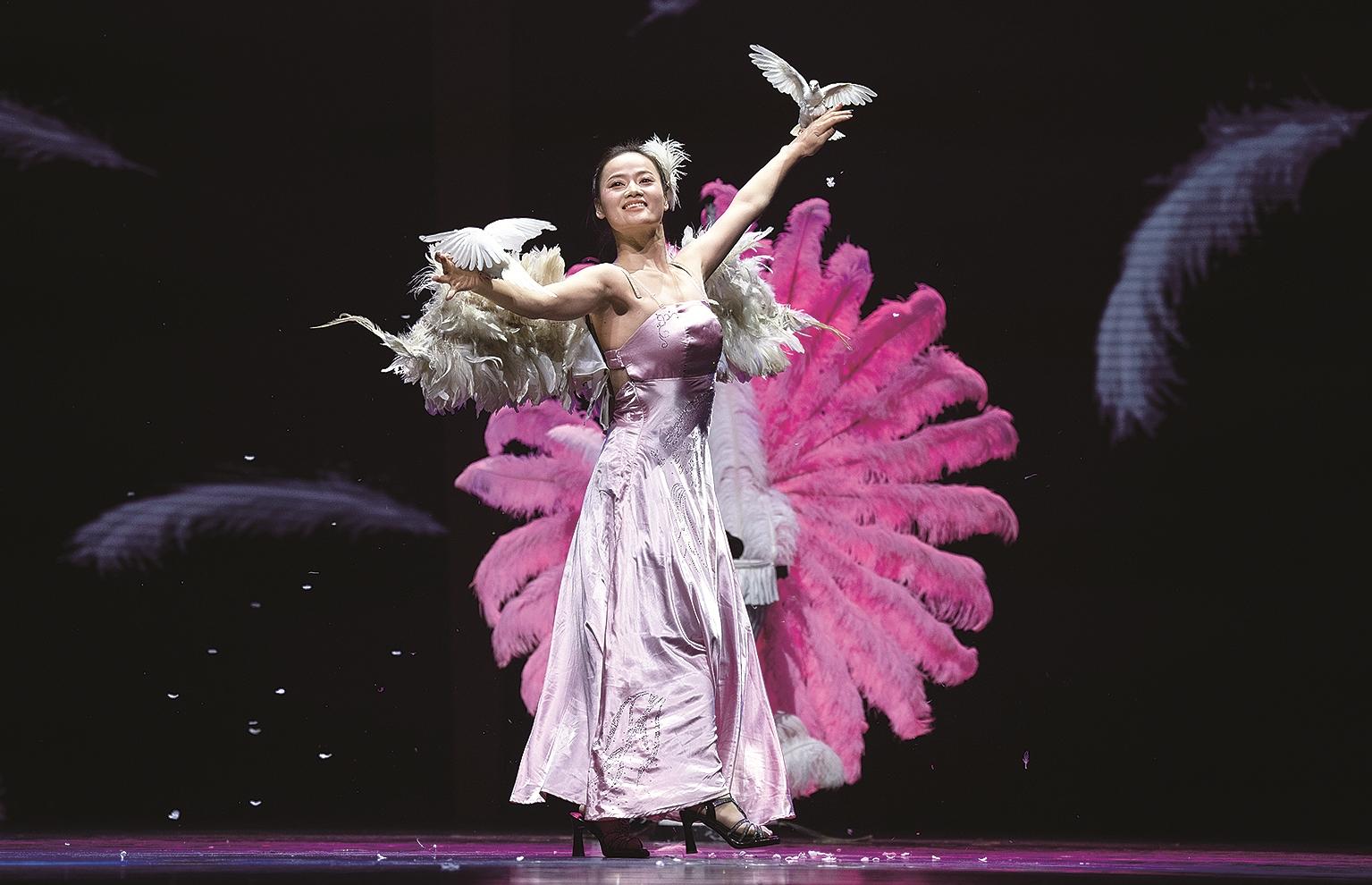 10月25日,在北京二七剧场举行的“艺苑撷英——2025年全国优秀青年艺术人才展演”上,射阳县杂技团演员表演魔术《羽》。 新华社记者 才扬 摄