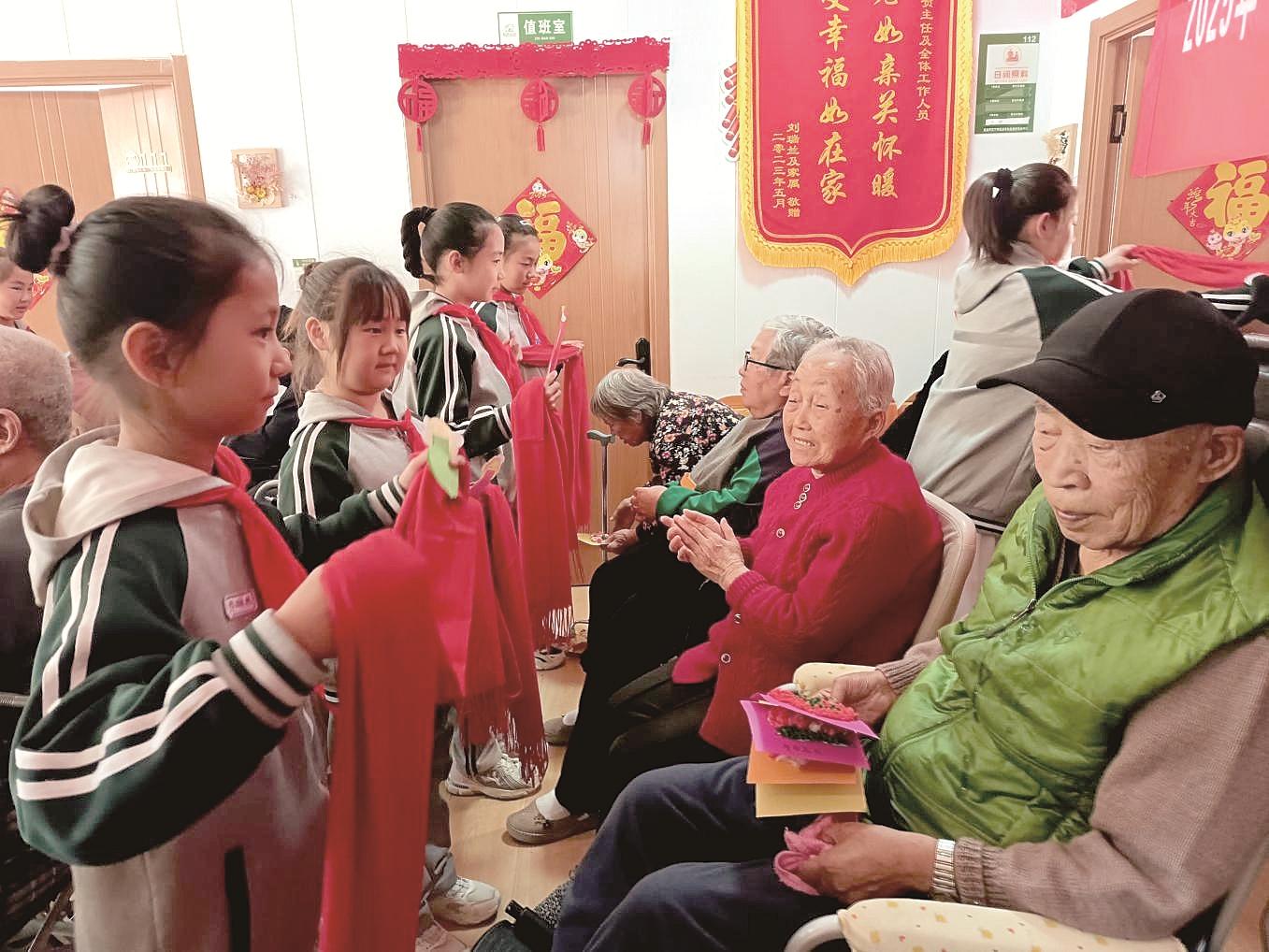 当音乐响起,穿着统一服装的小朋友们闪亮登场。他们伴随着轻快的旋律,跳起了优美的舞蹈。随后,小朋友们给老人们戴上红围脖,并用稚嫩的声音说道:“爷爷、奶奶,天凉了,要保暖哦。”同时,孩子们将亲手绘制写满祝福语的贺卡送到老人们的手中。演出结束后,孩子们还围坐在老人身边,听他们讲述过去的故事,笑声与回忆交织成秋日最暖的风景。这场跨越年龄的对话,不仅传递了节日温情,更让尊老敬老的种子在孩子们幼小的心田悄然生根。(青松社区党委供稿)