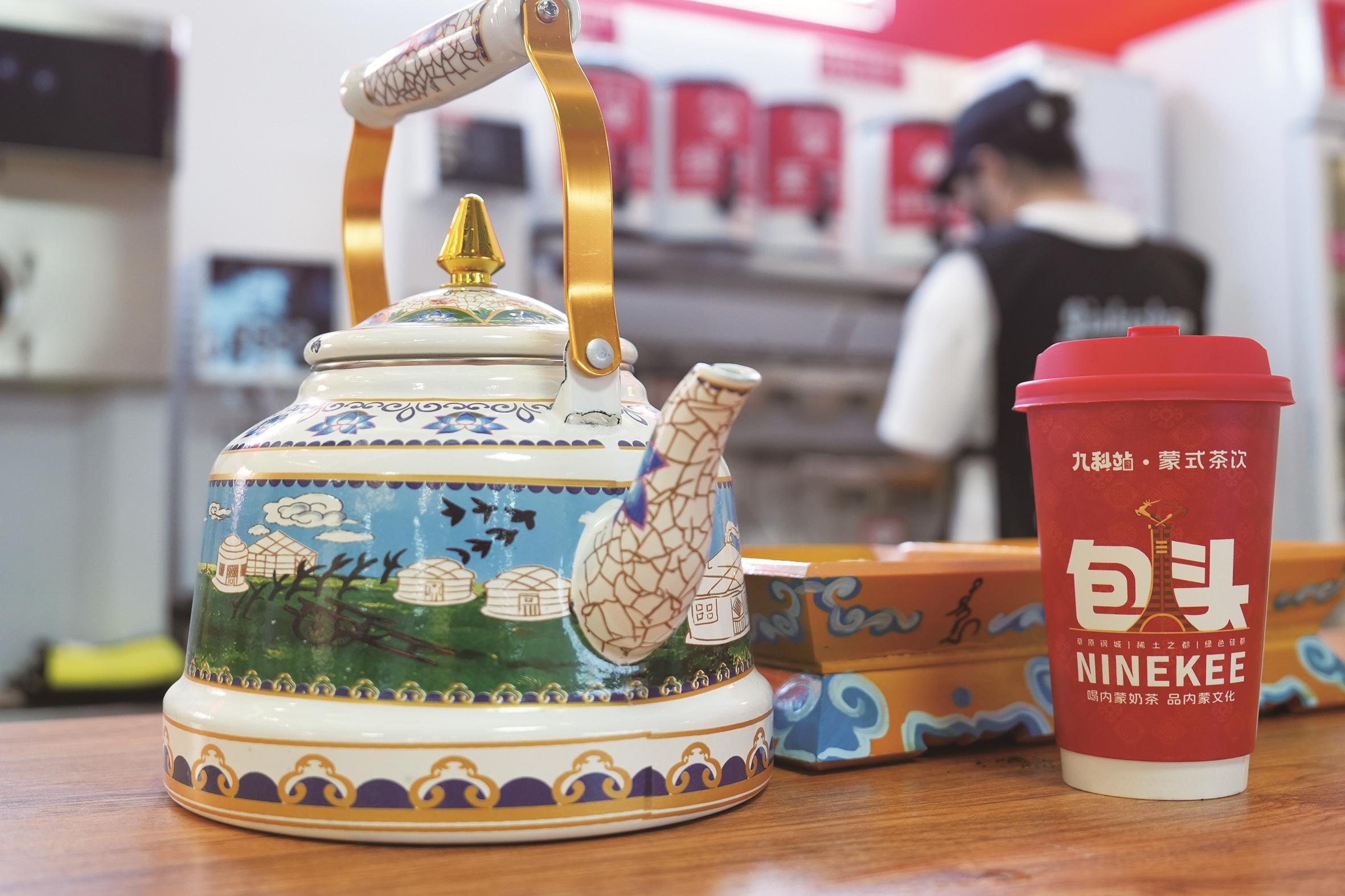 同样在老味道基础上注入“创新”的,还有蒙古族姑娘高焕创办的九科站茶饮店。“小时候看着家里人熬锅茶,砖茶的清香、牛奶的醇厚,是刻在骨子里的家乡味道。”高焕说,如今茶饮市场同质化严重,想闯出一条路,必须要有自己的特色。她将记忆中的传统锅茶改良升级,再搭配香脆的炒米、有嚼劲的牛肉干和奶皮子,装进便携奶茶杯,打造出独树一帜的“吉祥三宝”奶茶。