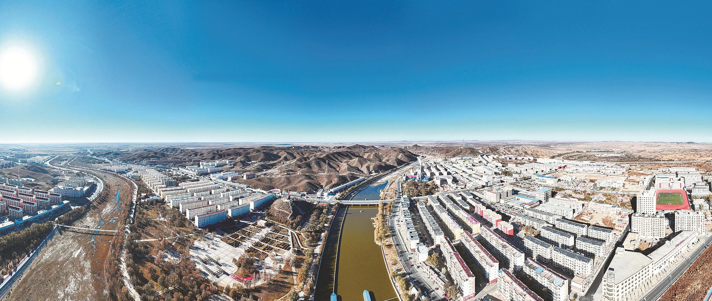 晚秋时节,达茂旗百灵庙镇沐浴在澄澈蓝天之下。艾不盖河宛如银链,蜿蜒穿过城区,两岸的楼群与远山黛色交织,构成一幅壮美的画卷。 记者 李强 摄