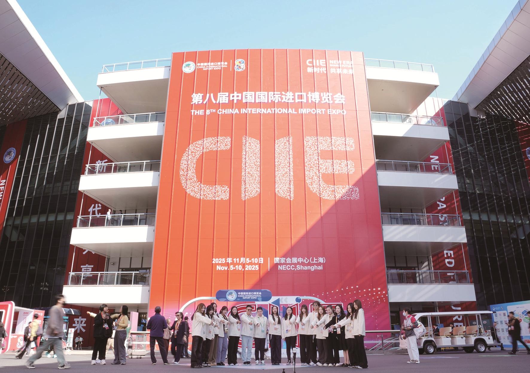 11月10日,人们在进博会巨幅标志前合影留念。新华社记者 刘颖 摄