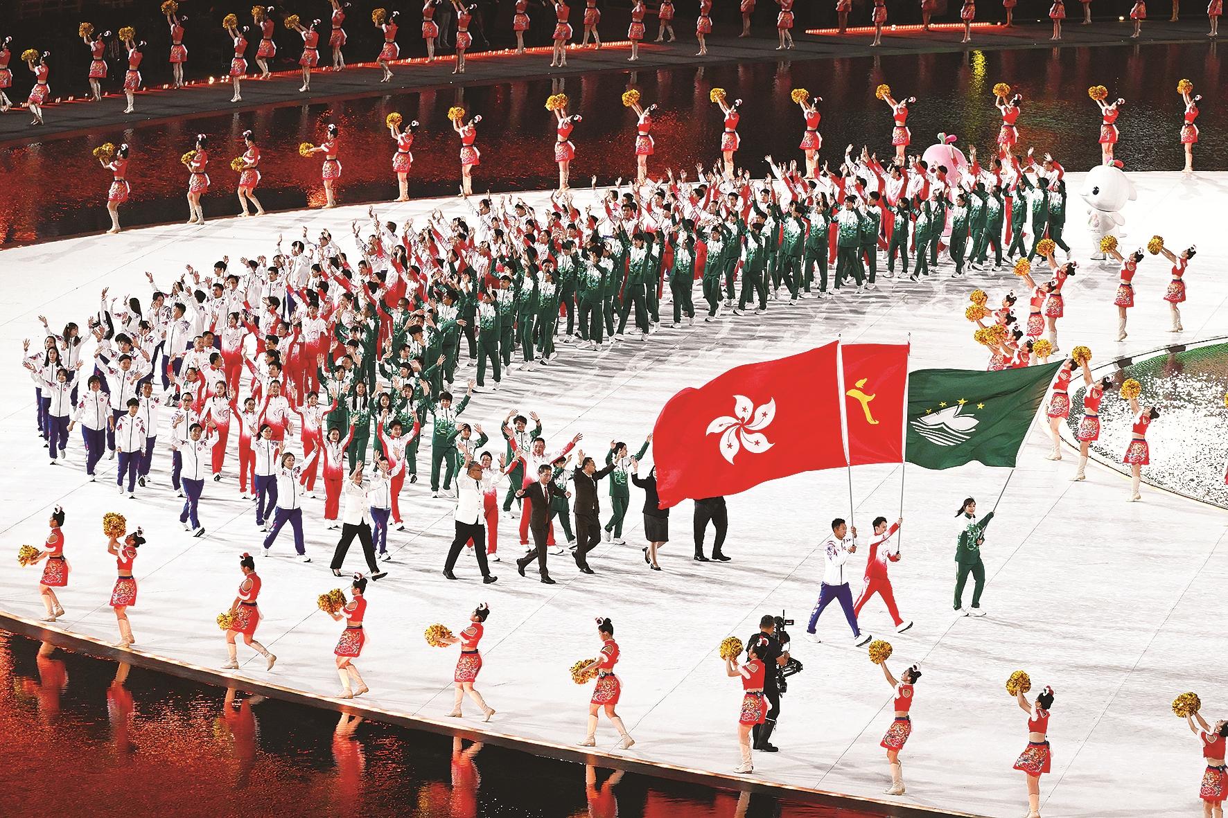 “国运兴则体育兴,体育强则中国强”,《中华体育精神颂》诵声铿锵;《我和我的祖国》旋律悠扬,来自全国37个代表团的运动健儿依次入场。当广东省、香港特别行政区、澳门特别行政区组成的东道主方阵并肩入场时,现场的掌声格外热烈。