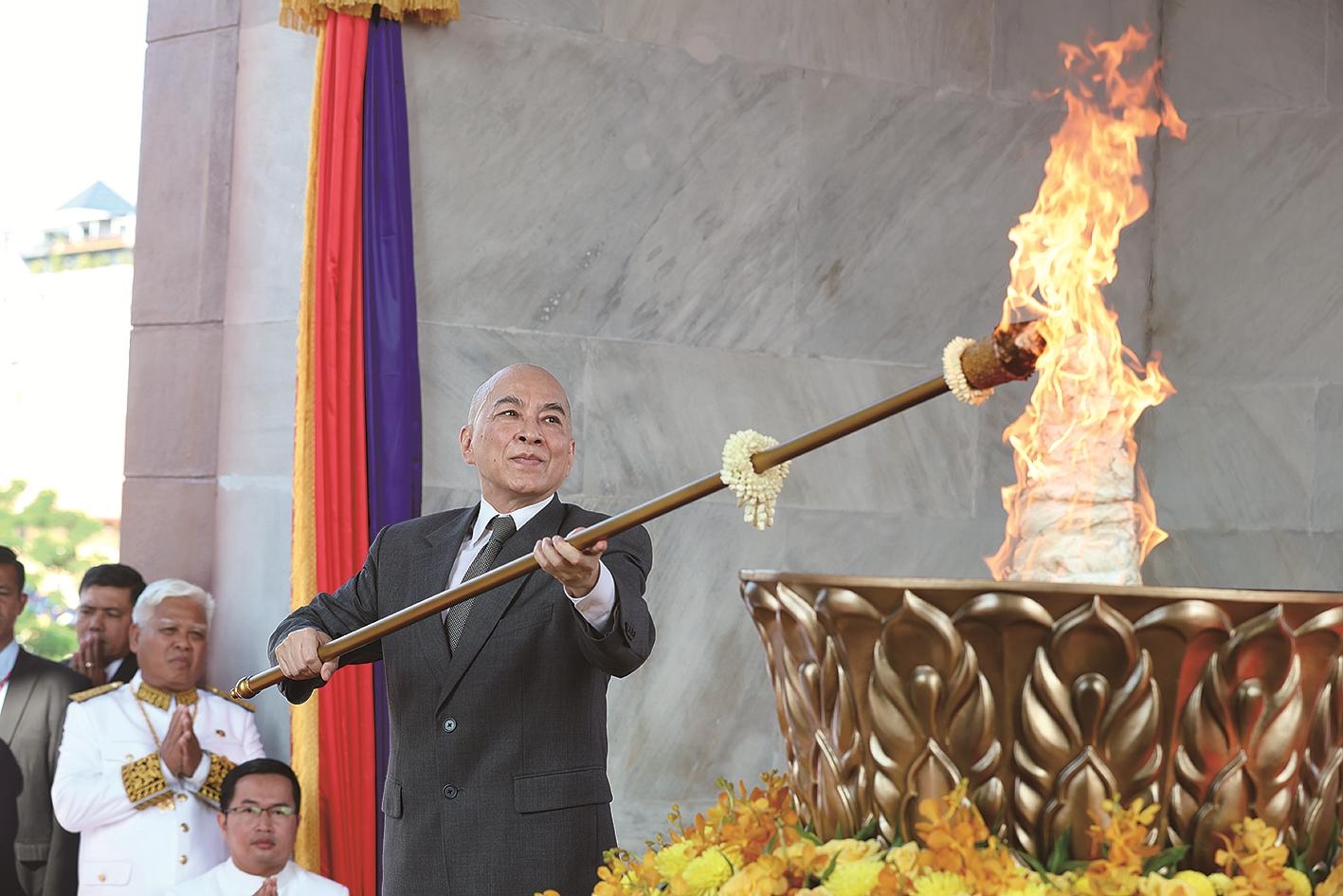 柬埔寨11月9日在首都金边举行活动庆祝国家独立72周年。柬埔寨国王西哈莫尼点燃独立纪念碑的“胜利之火”。
