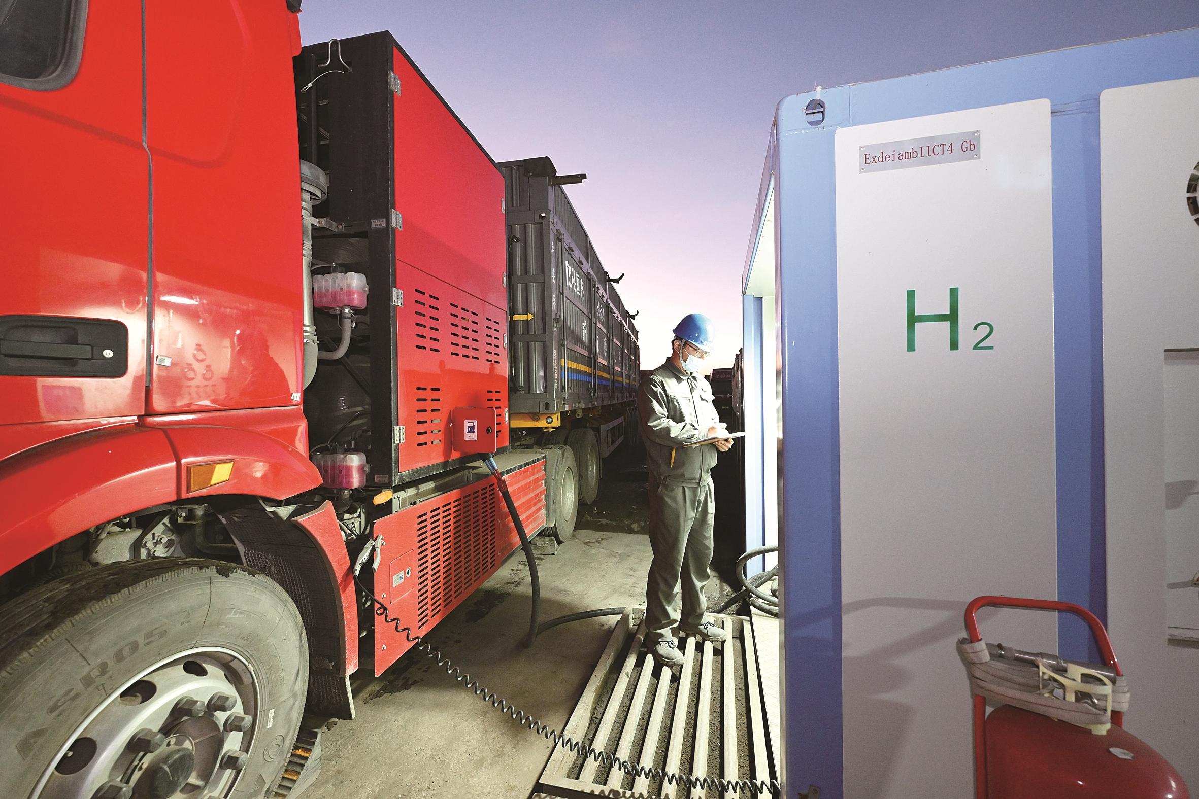 11月10日,包头华电氢能河西加氢站工作人员正在为氢能重卡加氢。据了解,该加氢站位于G7西部陆港,已投用2座撬装站,围绕华电河西电厂建立零碳运输网,为氢能重卡提供绿氢动力来源。