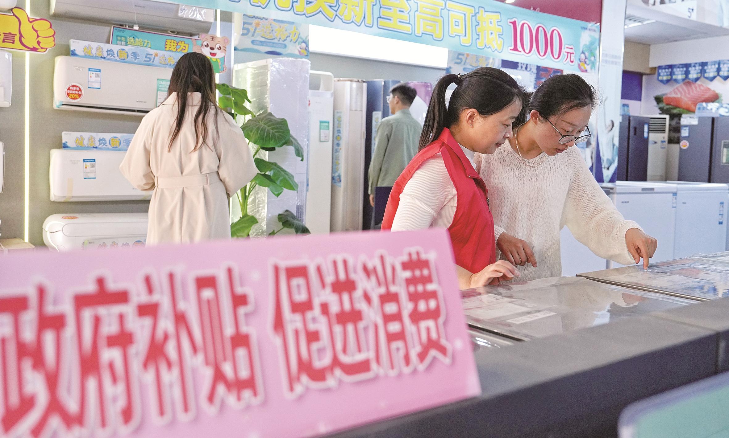 2025年5月2日,顾客在江苏省海安市墩头镇一家商场选购补贴家电。 新华社发(周强 摄)