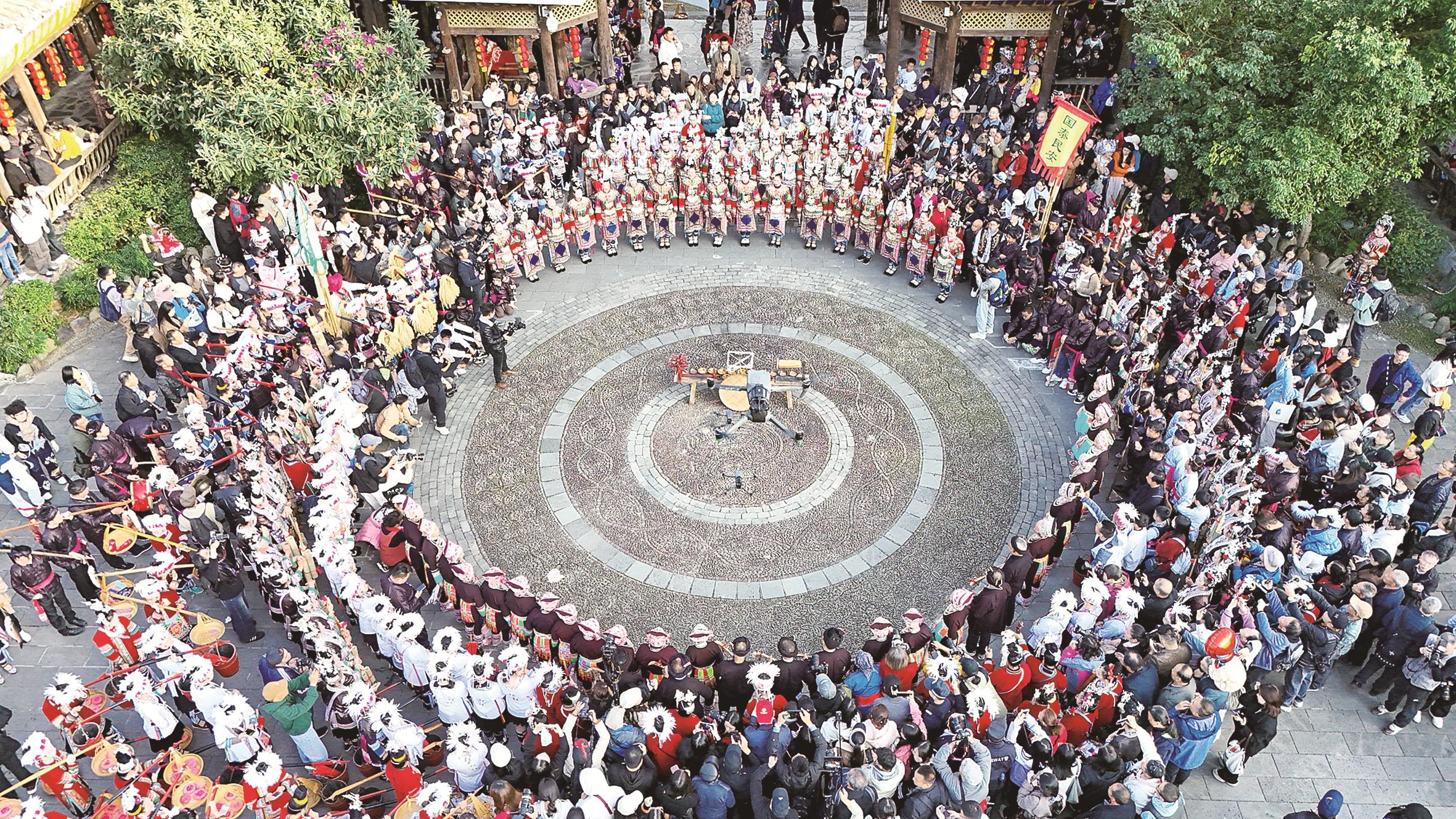 2024年11月30日,侗族群众在贵州省黔东南苗族侗族自治州黎平县肇兴侗寨进行文艺表演(无人机照片)。新华社发(王纯亮 摄)