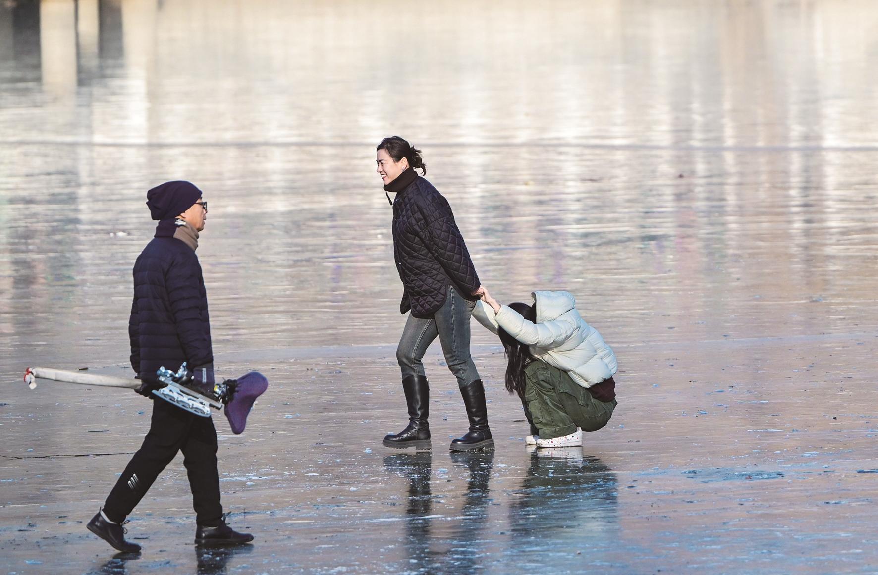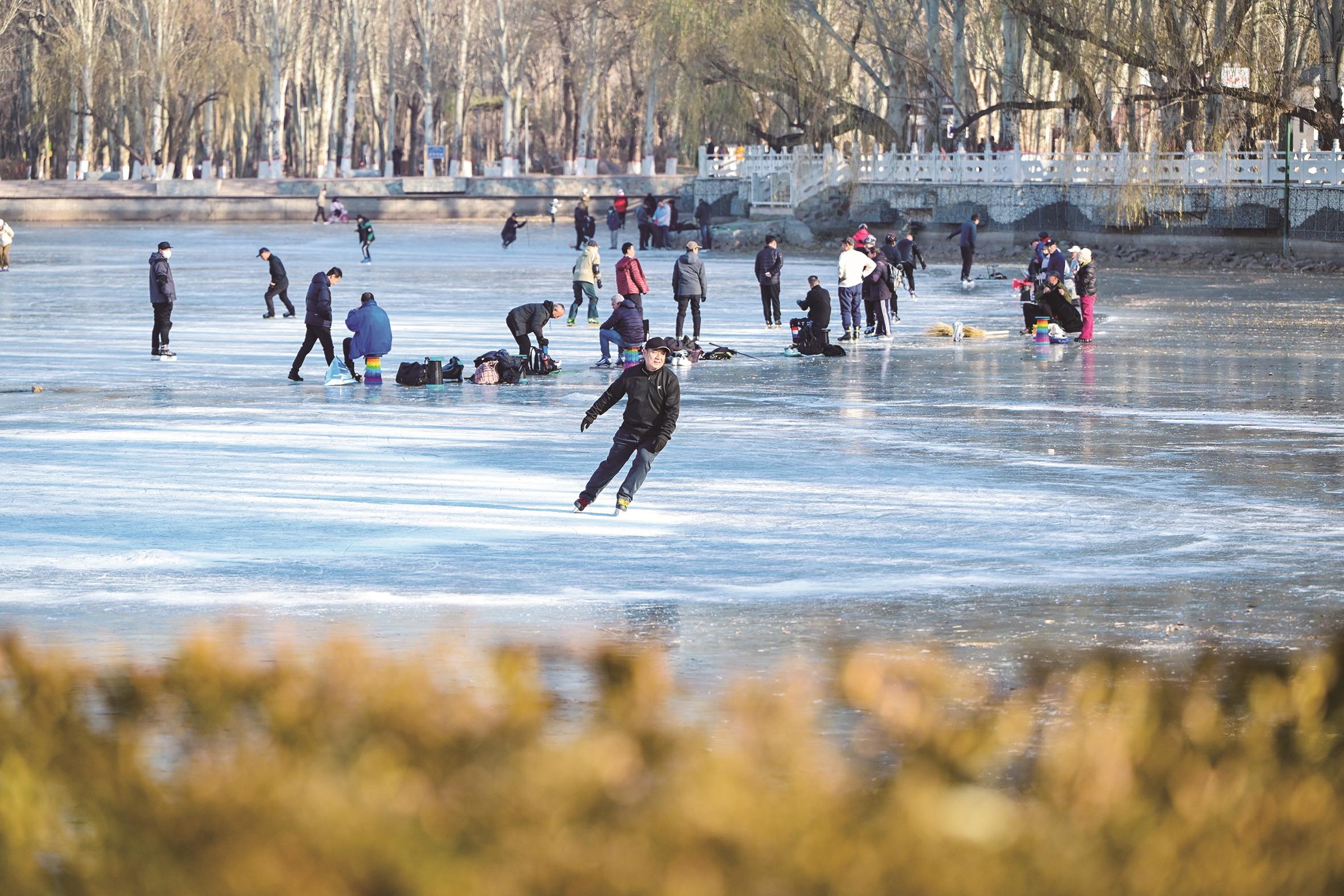 过了小雪节气,冬天随着寒风抵达。劳动公园的湖面已化作一方晶莹的天然冰场,众多滑冰爱好者循着寒意而来,冰封的湖面漾起阵阵欢声笑语。