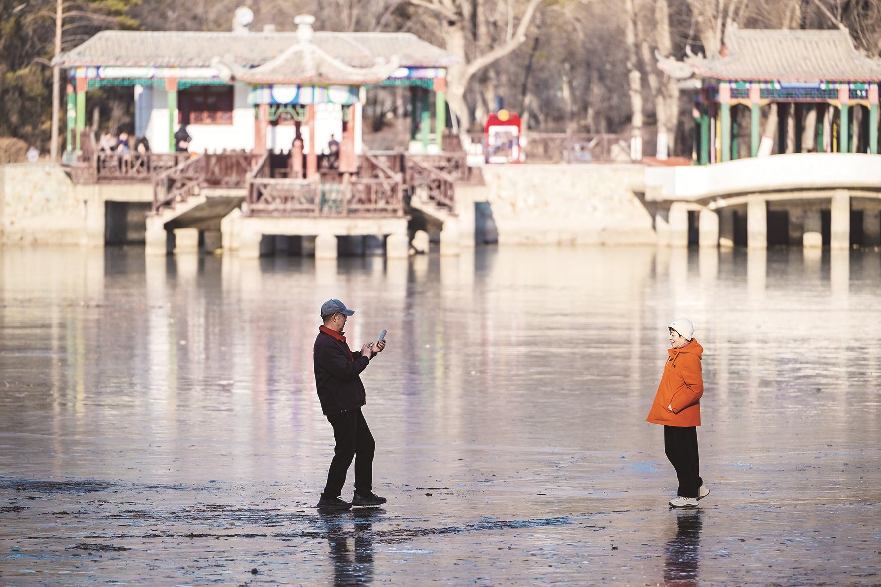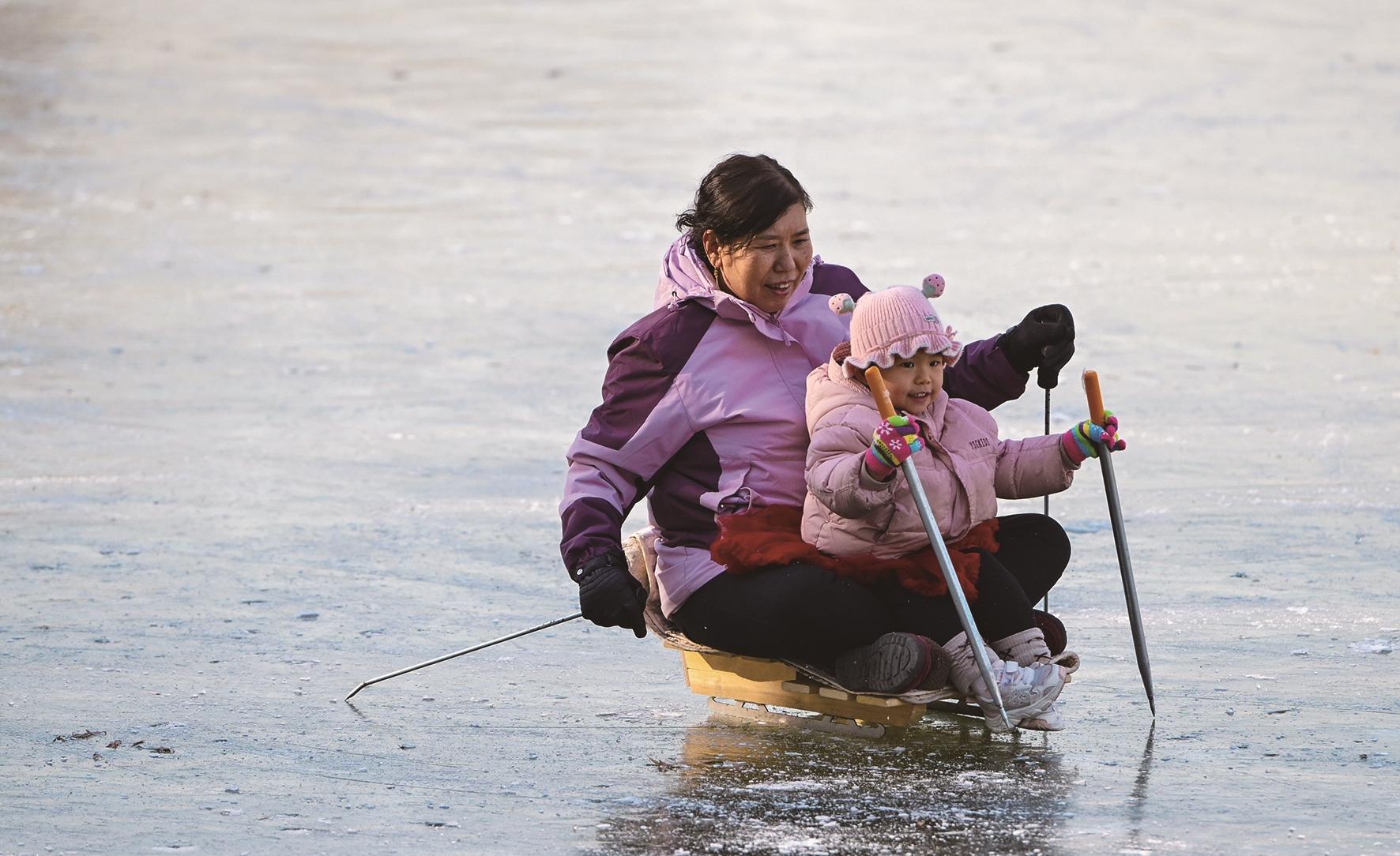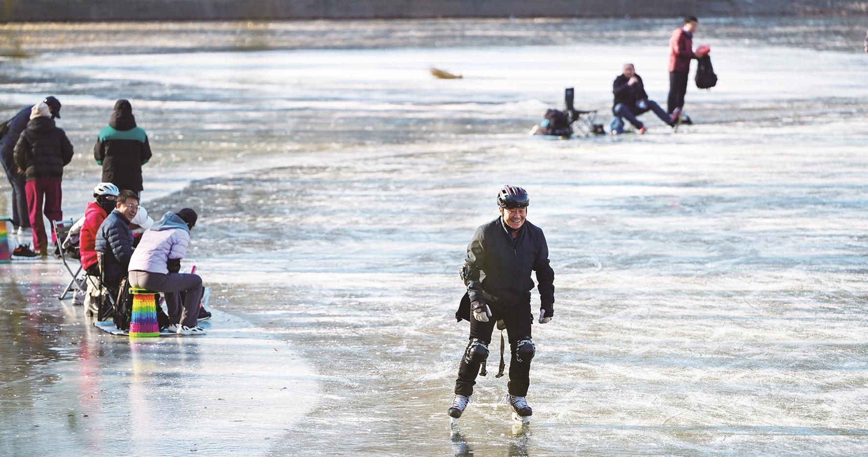 过了小雪节气,冬天随着寒风抵达。劳动公园的湖面已化作一方晶莹的天然冰场,众多滑冰爱好者循着寒意而来,冰封的湖面漾起阵阵欢声笑语。