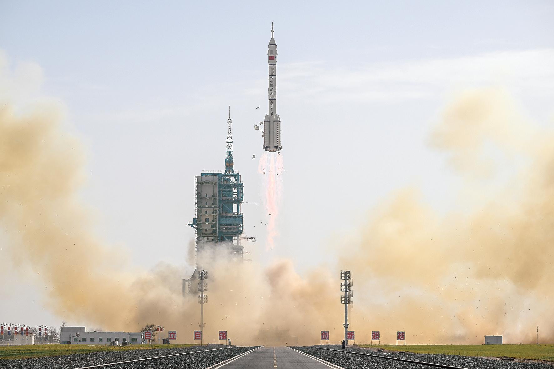 十一月二十五日,搭载神舟二十二号飞船的长征二号F遥二十二运载火箭,在酒泉卫星发射中心点火发射。神舟二十二号飞船与长征火箭成功分离并进入预定轨道,发射任务取得圆满成功。这是中国载人航天工程第一次应急发射任务。新华社记者 连振 摄