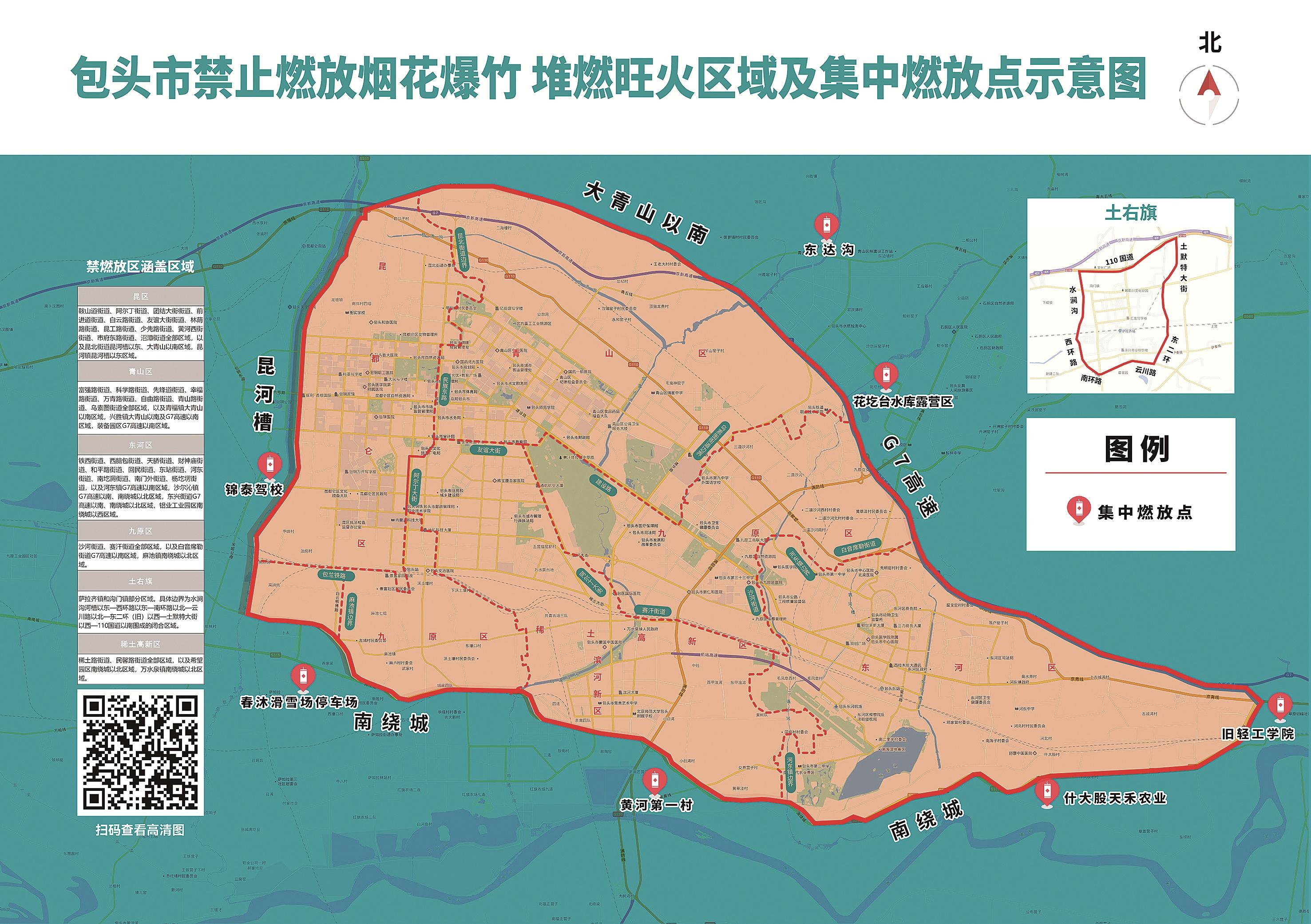 2.土默特右旗:萨拉齐镇和沟门镇部分区域。具体边界为水涧沟河槽以东——西环路以东——南环路以北——云川路以北——东二环(旧)以西——土默特大街以西——110国道以南围成的闭合区域。