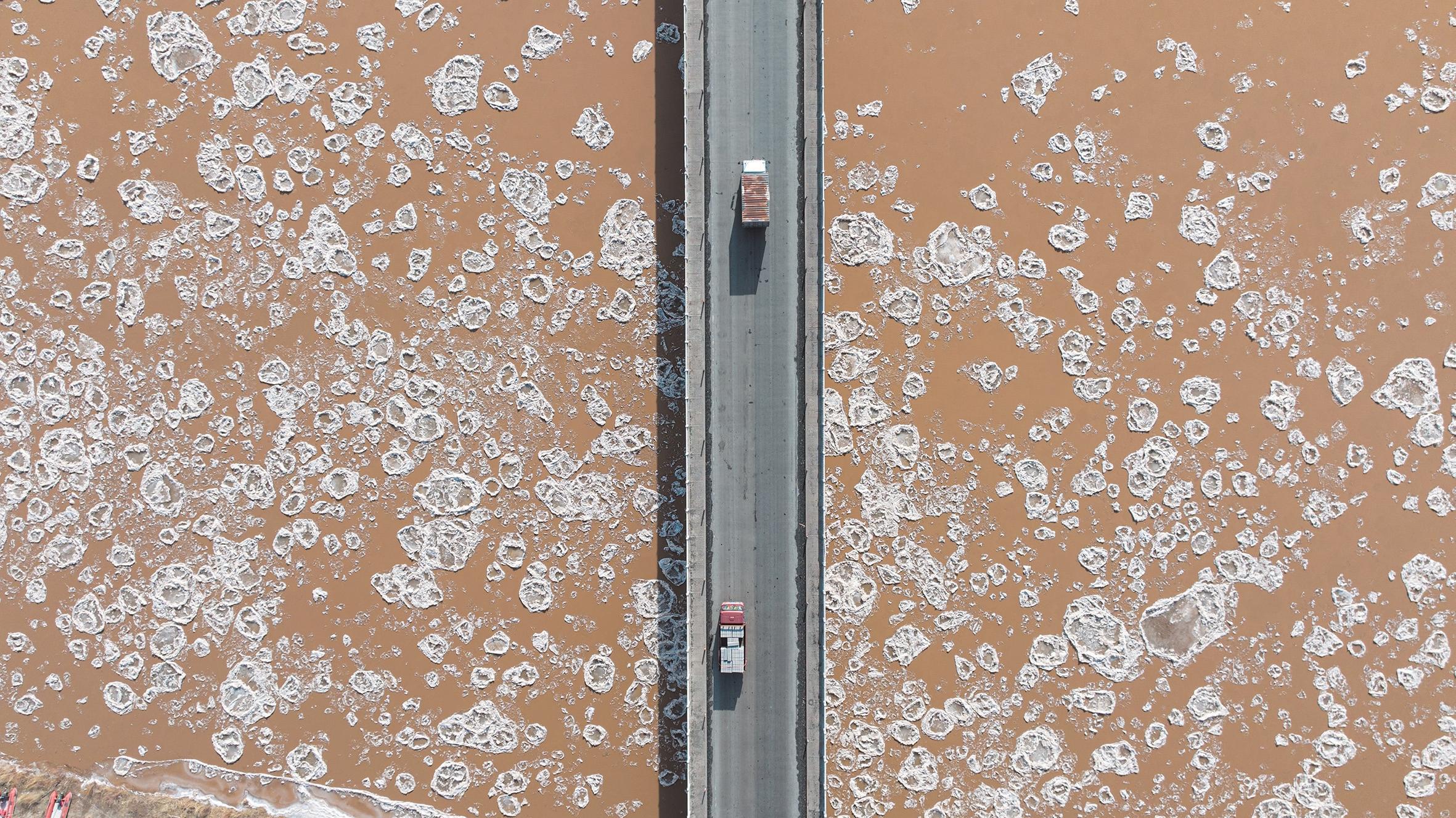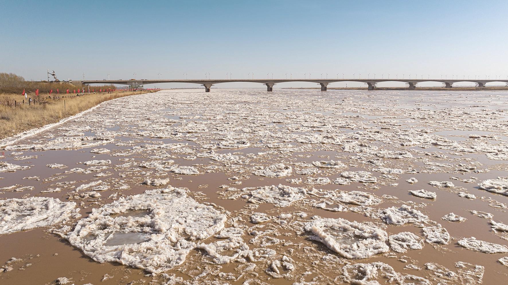 11月27日,黄河包头段迎来今冬流凌盛景。宽阔的河面绽放出万千冰花,如甲胄披身的将士以排山倒海之势由西向东奔涌而去,冰凌碰撞的浑厚声奏响了冬日黄河的雄浑乐章。